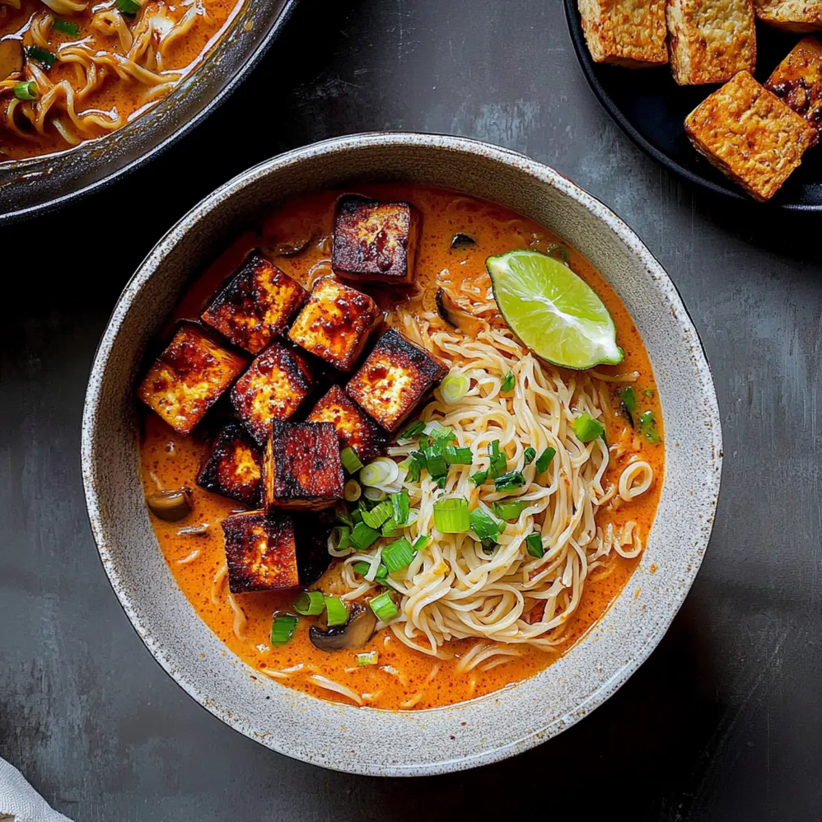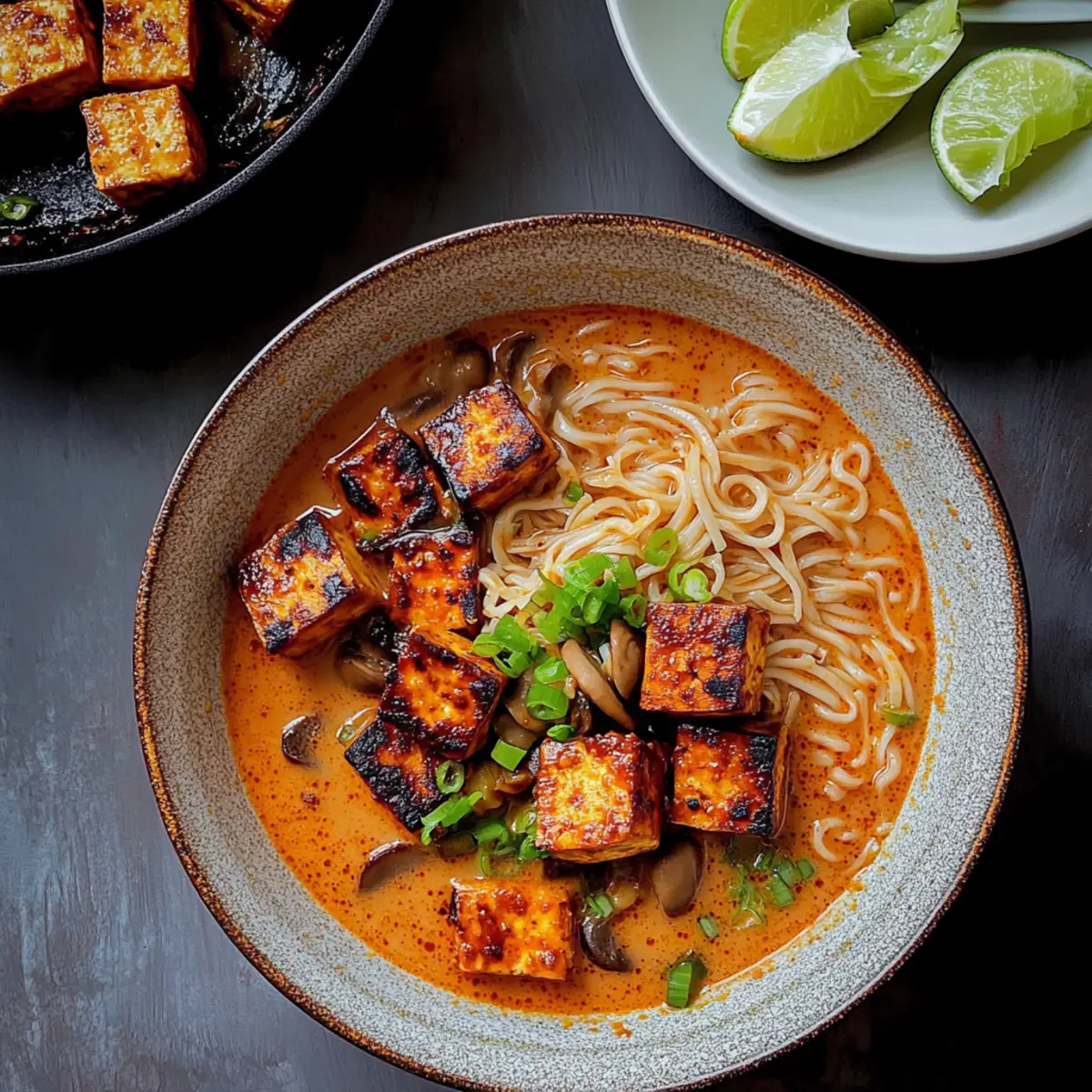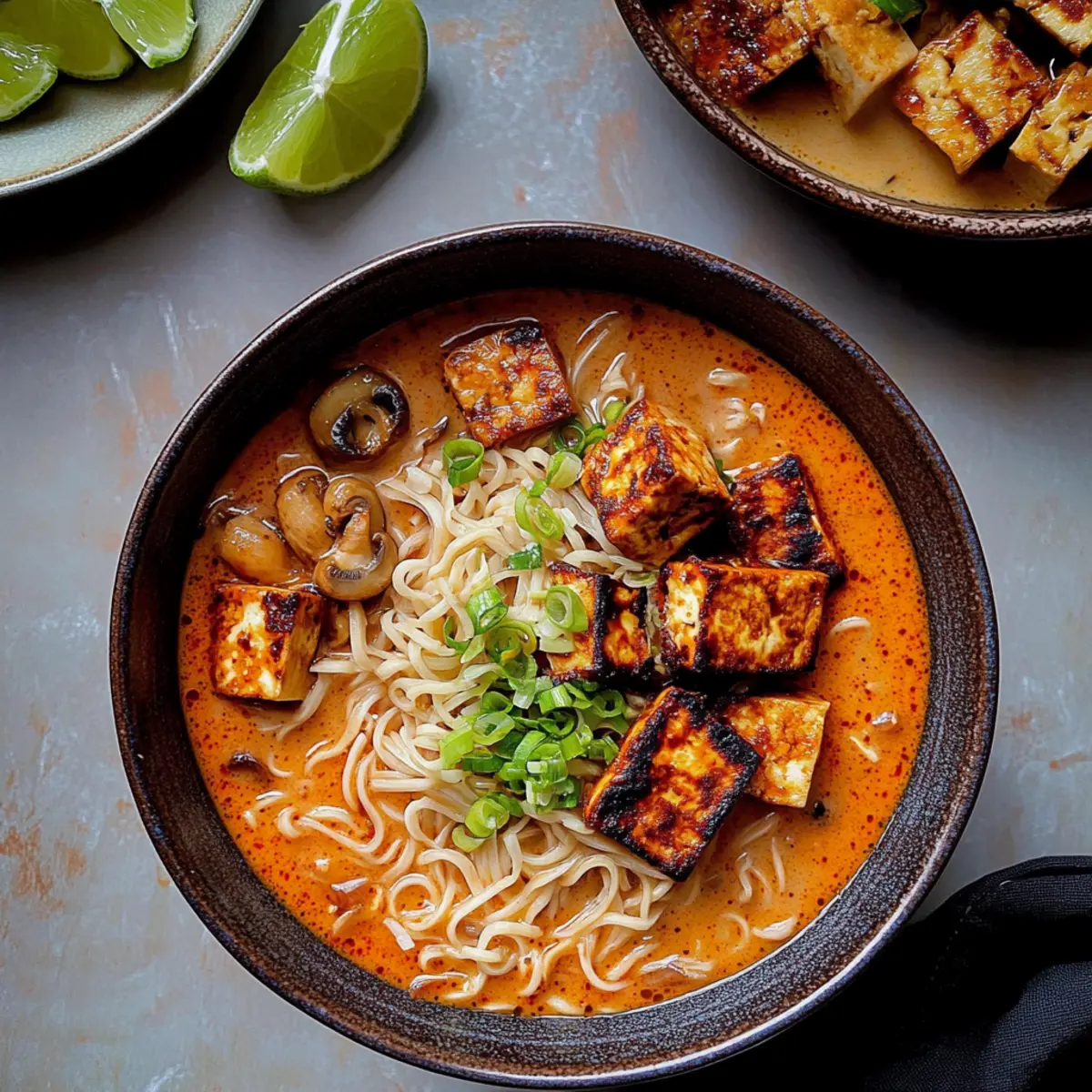 - Once the noodles are cooked to perfection, ladle generous amounts of broth and noodles into serving bowls. Top each bowl with a portion of the crispy tofu and sautéed mushrooms. Garnish with lime wedges, chopped green onions, and a sprinkle of sesame seeds.