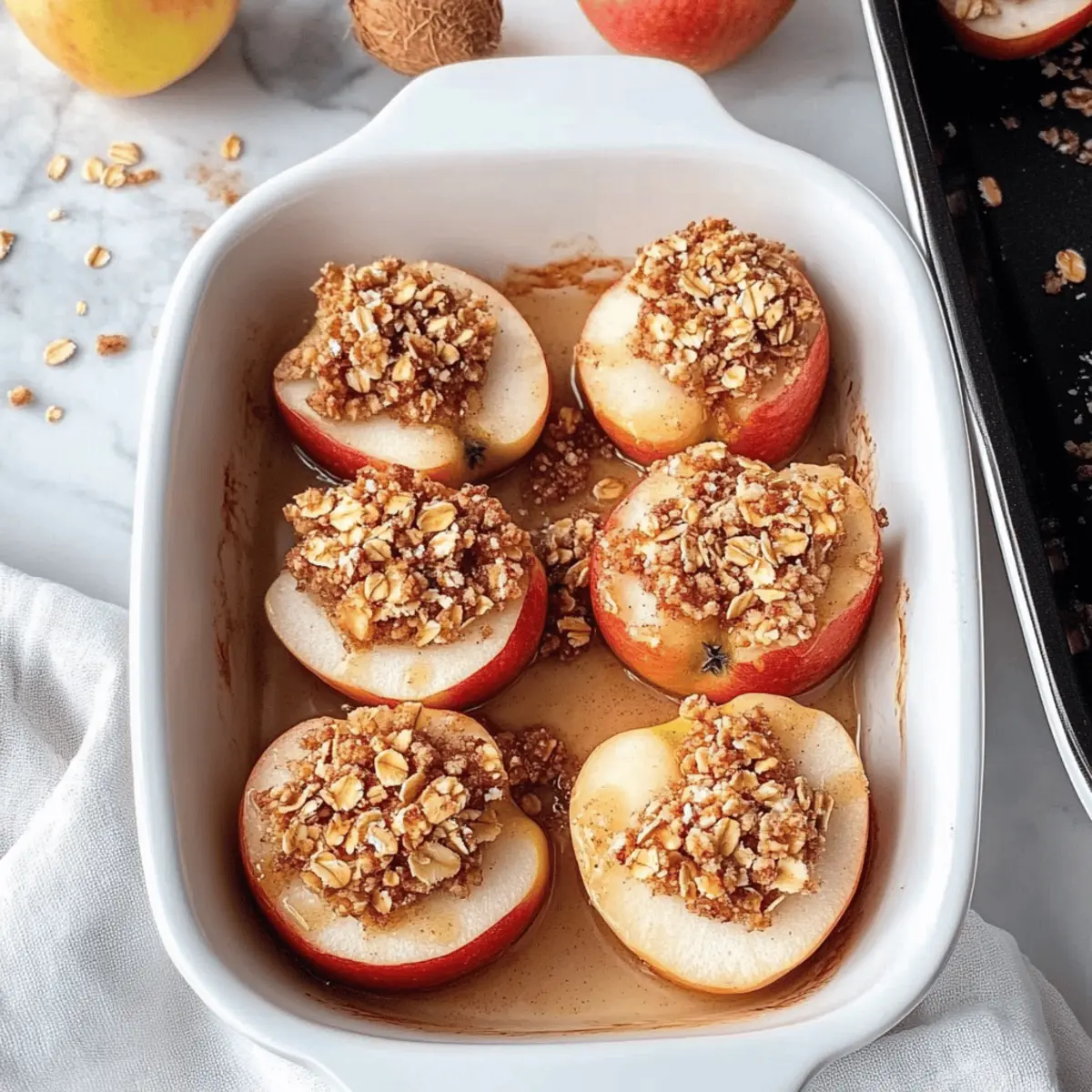 These baked apples are perfect for meal prep, allowing you to indulge in their comforting flavors with minimal effort during busy weeknights! You can prepare the crunchy topping up to 3 days in advance by mixing all the dry ingredients and incorporating the coconut oil. Store it in an airtight container in the refrigerator to maintain its freshness and crunch. The apple halves can be prepped, cored, and stored in the fridge for up to 24 hours; just be sure to rub them with melted coconut oil to prevent browning. When ready to serve, simply pre-bake the apples, add the topping, and finish baking for a delightful dessert that feels just as special, even on a hectic evening.