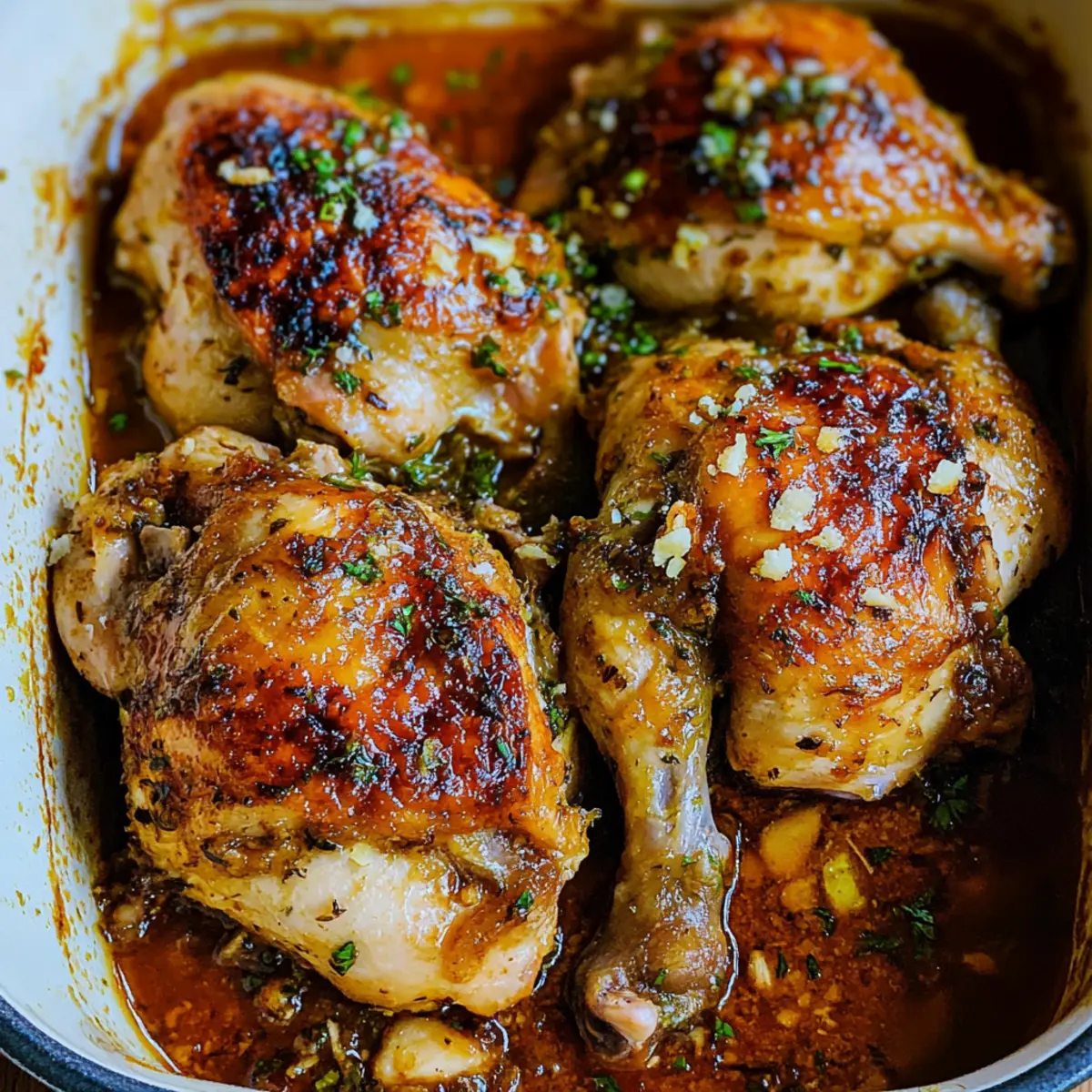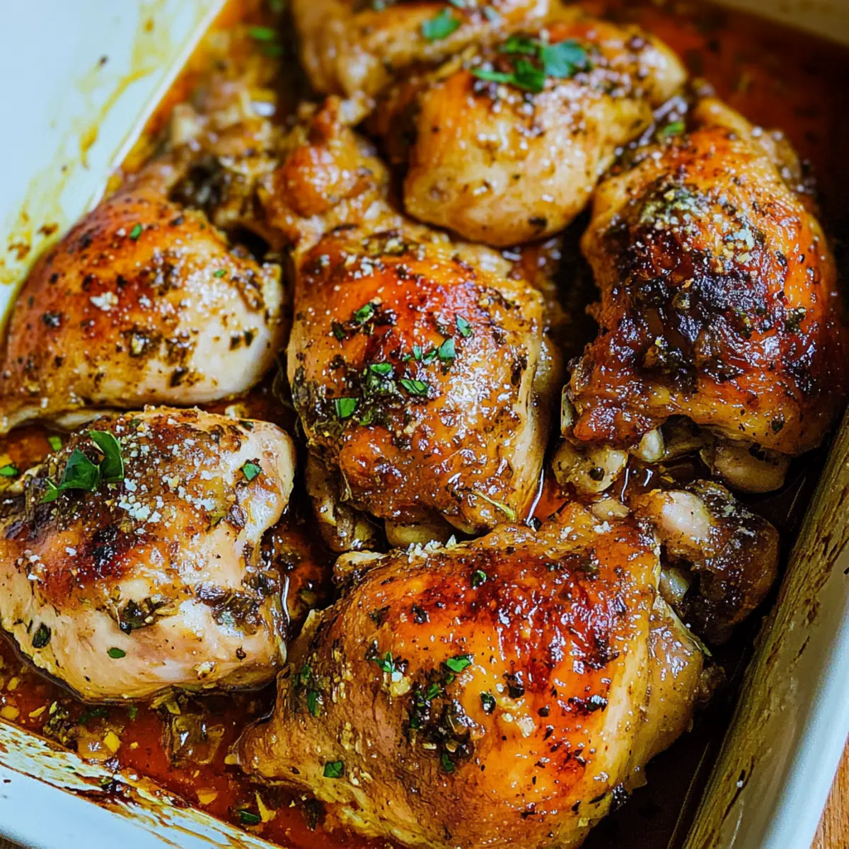 Place the baking dish in your preheated oven and bake for about 1 hour and 45 minutes. Check the chicken occasionally; it’s done when the juices run clear and the meat pulls away from the bone, indicating tender, perfectly cooked chicken.
