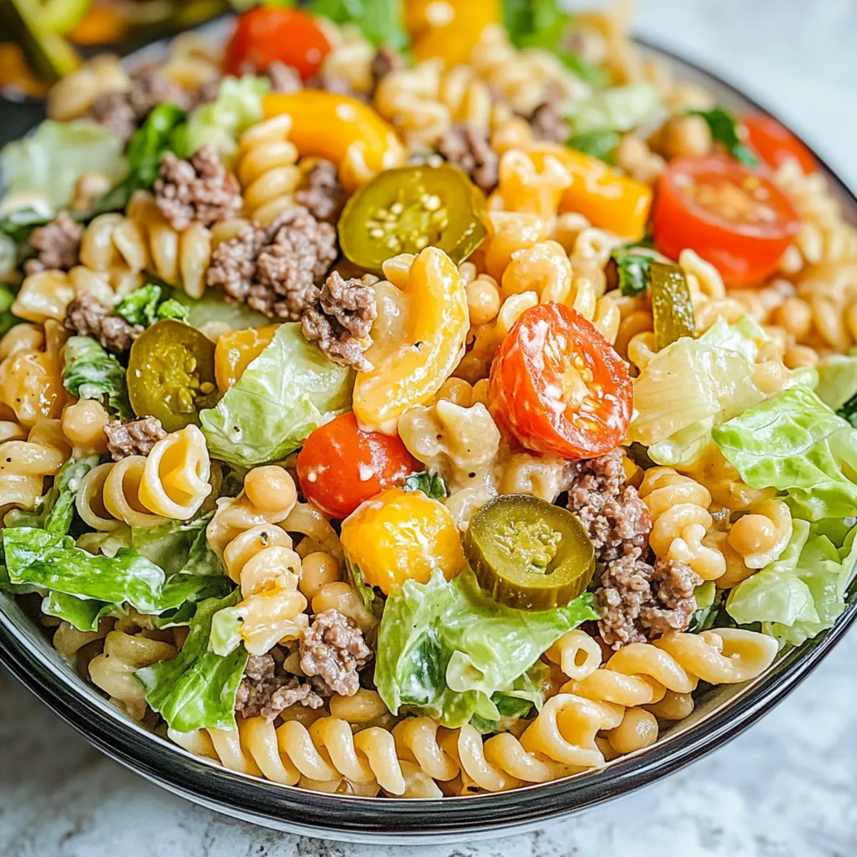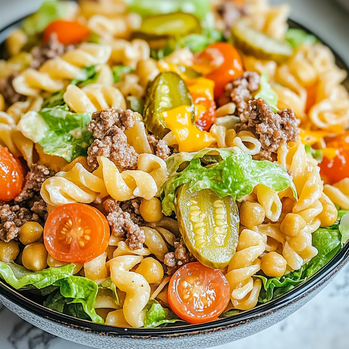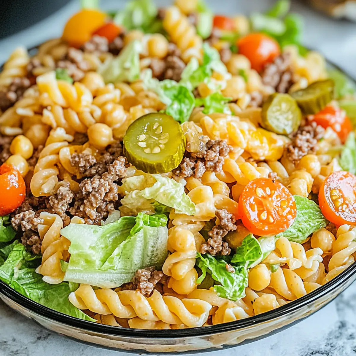 When selecting vegetables, look for vibrant colors and firmness. For instance, grape tomatoes should be plump and free of dark spots. Romaine lettuce should be crisp, and pickles should be bright without any signs of wilting. Fresh ingredients will elevate your Big Mac Pasta Salad and contribute to its overall deliciousness!