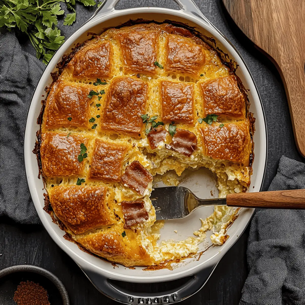 Deliciously Hearty: Each bite of this casserole delivers a satisfying blend of textures and flavors, with crispy bacon and gooey cheese enveloped by flaky biscuits.