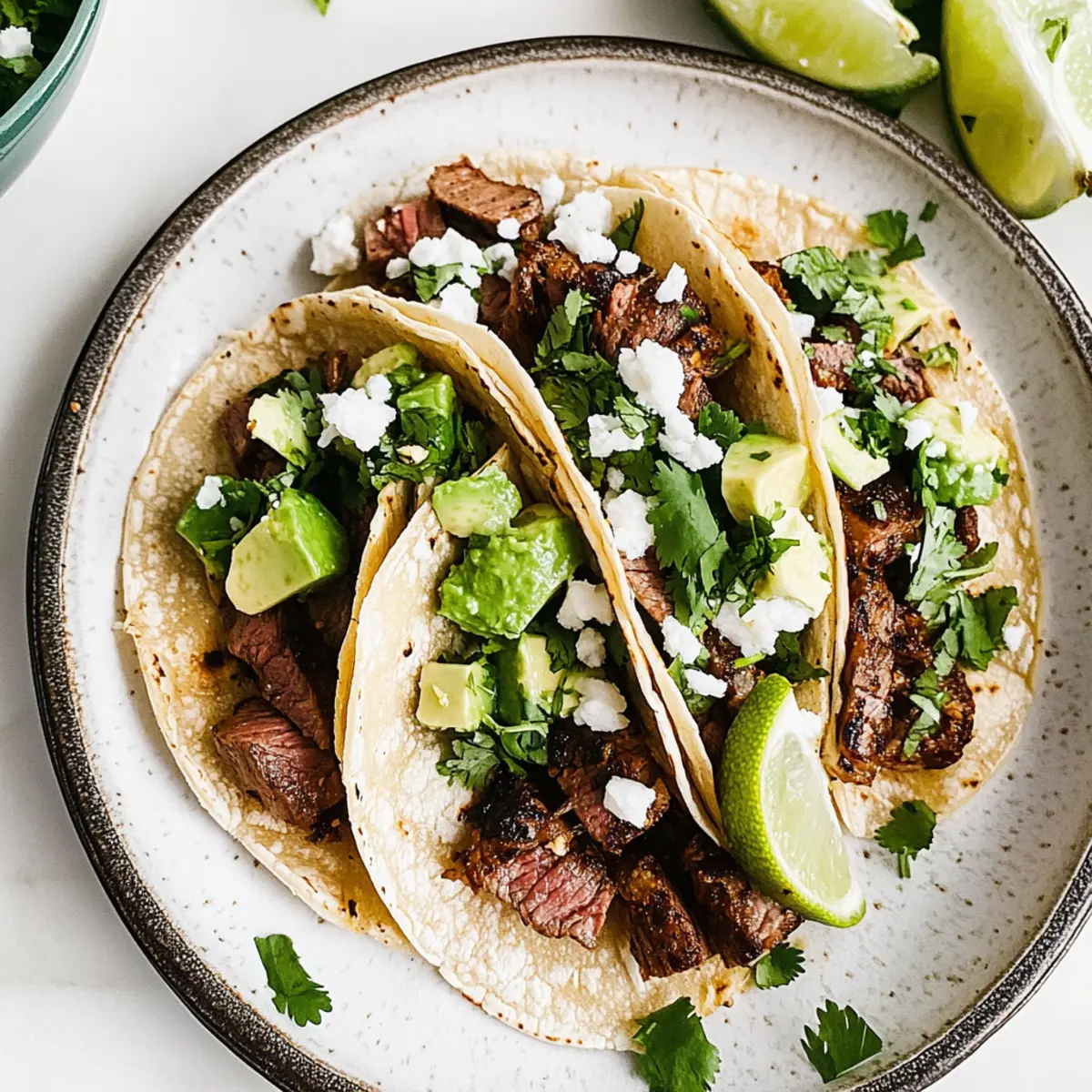 Before serving, generously squeeze fresh lime juice over the assembled carne asada tacos. This bright adds a zesty kick, enhancing the flavor profile of your tacos. Serve immediately while still warm, and enjoy the delightful combination of flavors in every bite!