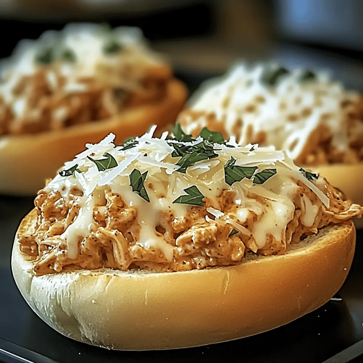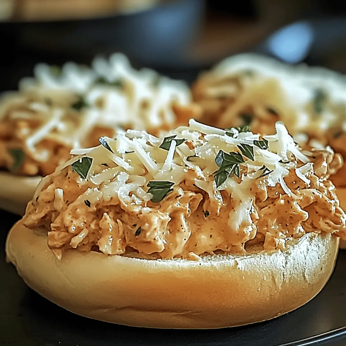 Toast your hamburger buns in another skillet or toaster until golden brown. Once ready, generously spoon the creamy chicken Alfredo mixture onto the bottom half of each bun, allowing the rich flavors to soak in slightly. Top with the other half of the bun, creating the perfect vessel for your Chicken Alfredo Sloppy Joes. For an added touch, feel free to sprinkle extra Parmesan cheese on top.