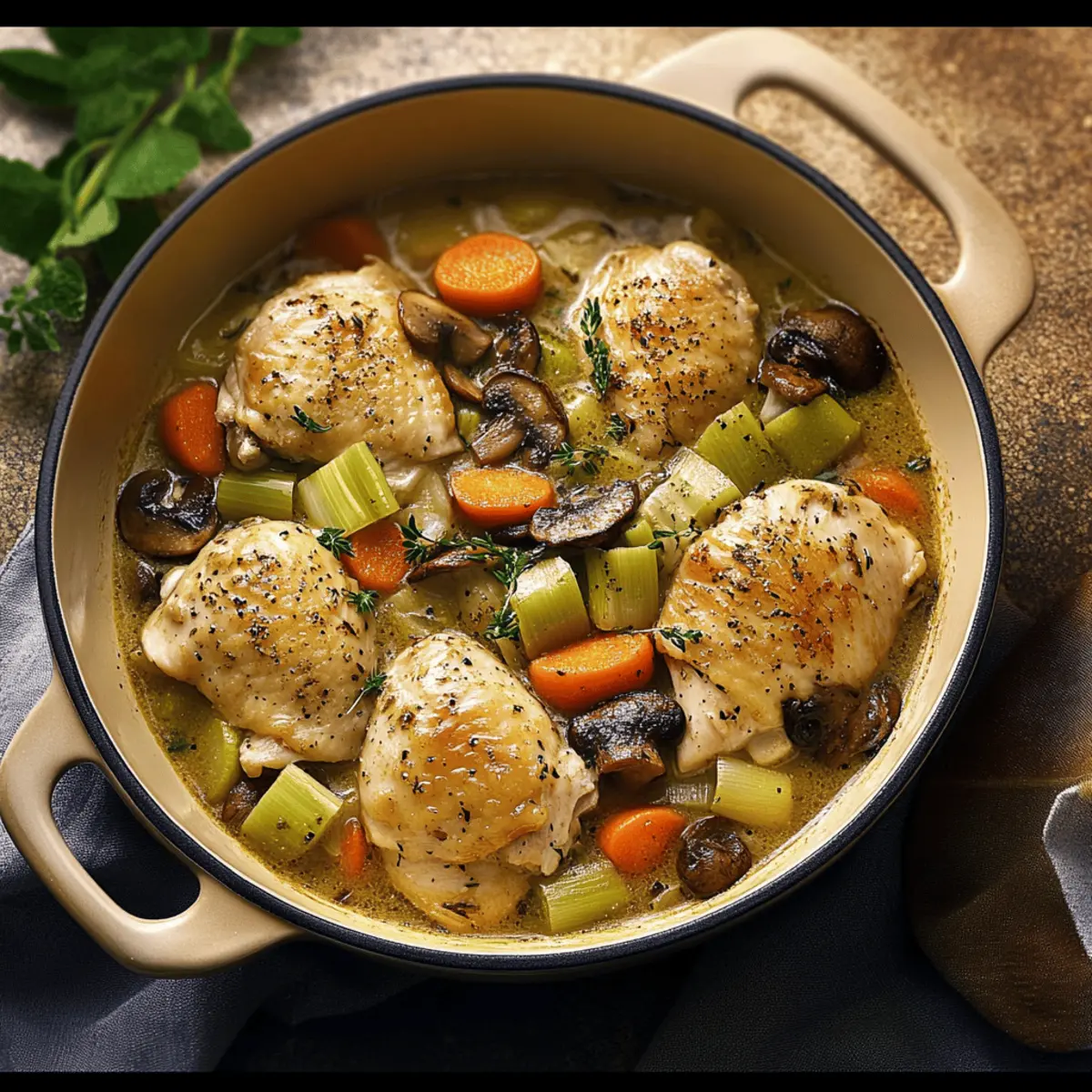 - Bone-in, skin-on chicken thighs – Provides rich flavor and juicy texture; boneless thighs can be used for quicker cooking.