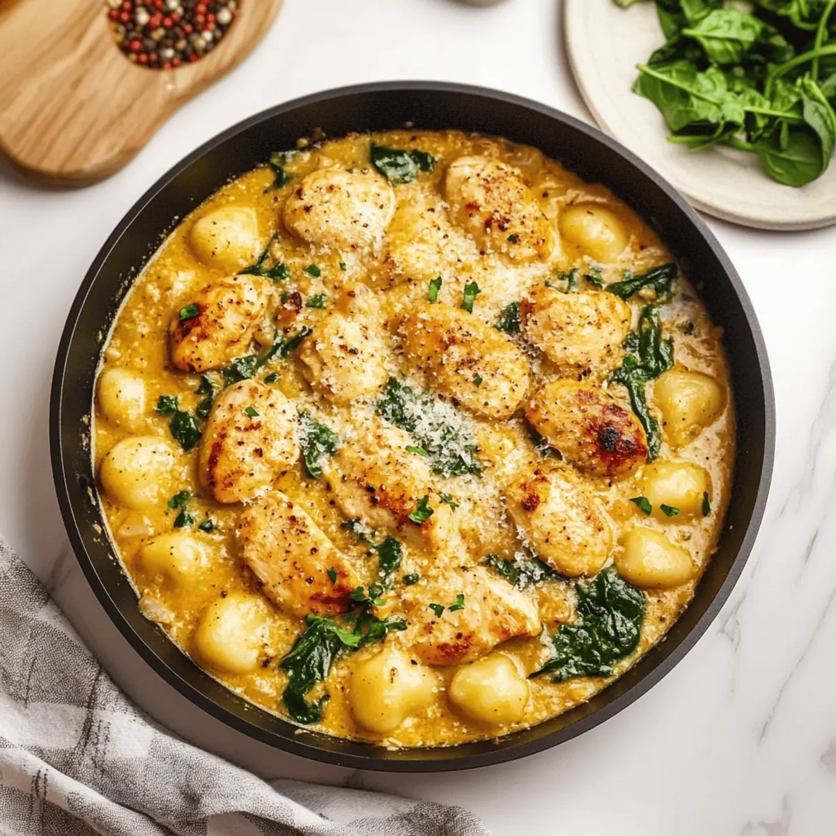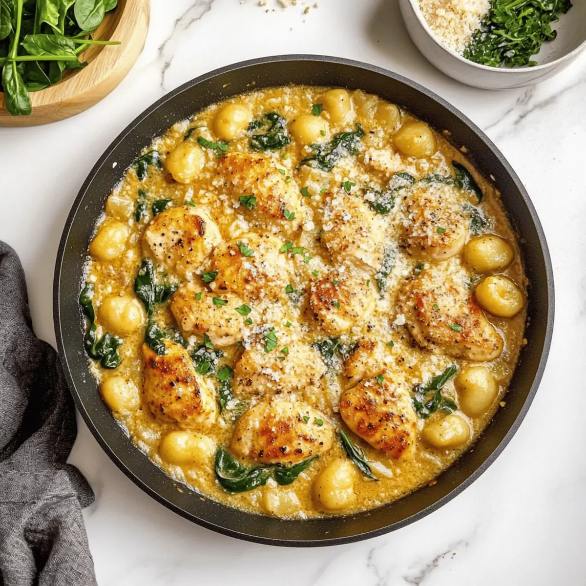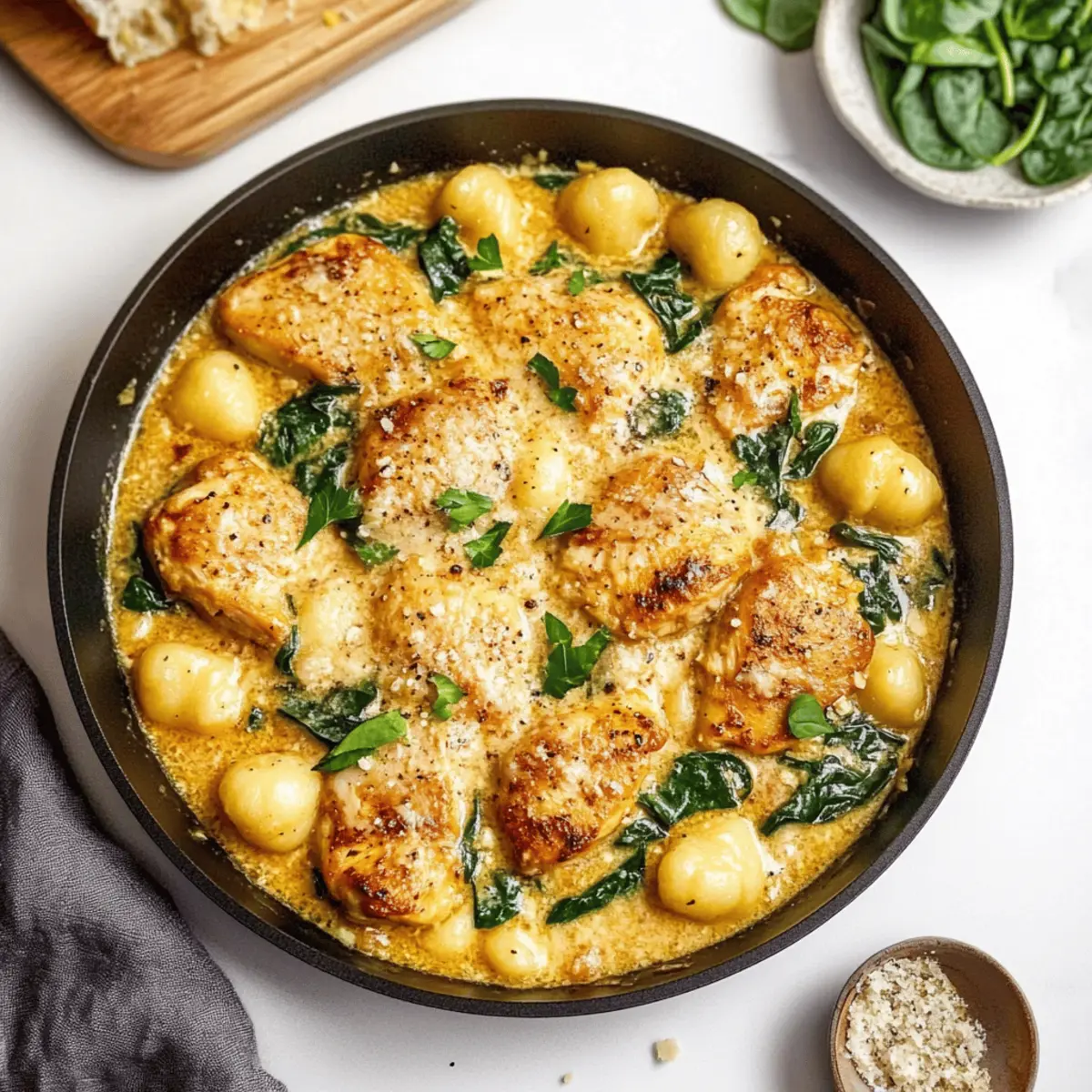 - Stir in the cooked gnocchi and spinach, then nestle the chicken back into the skillet. Simmer for an additional 2-3 minutes until heated through.