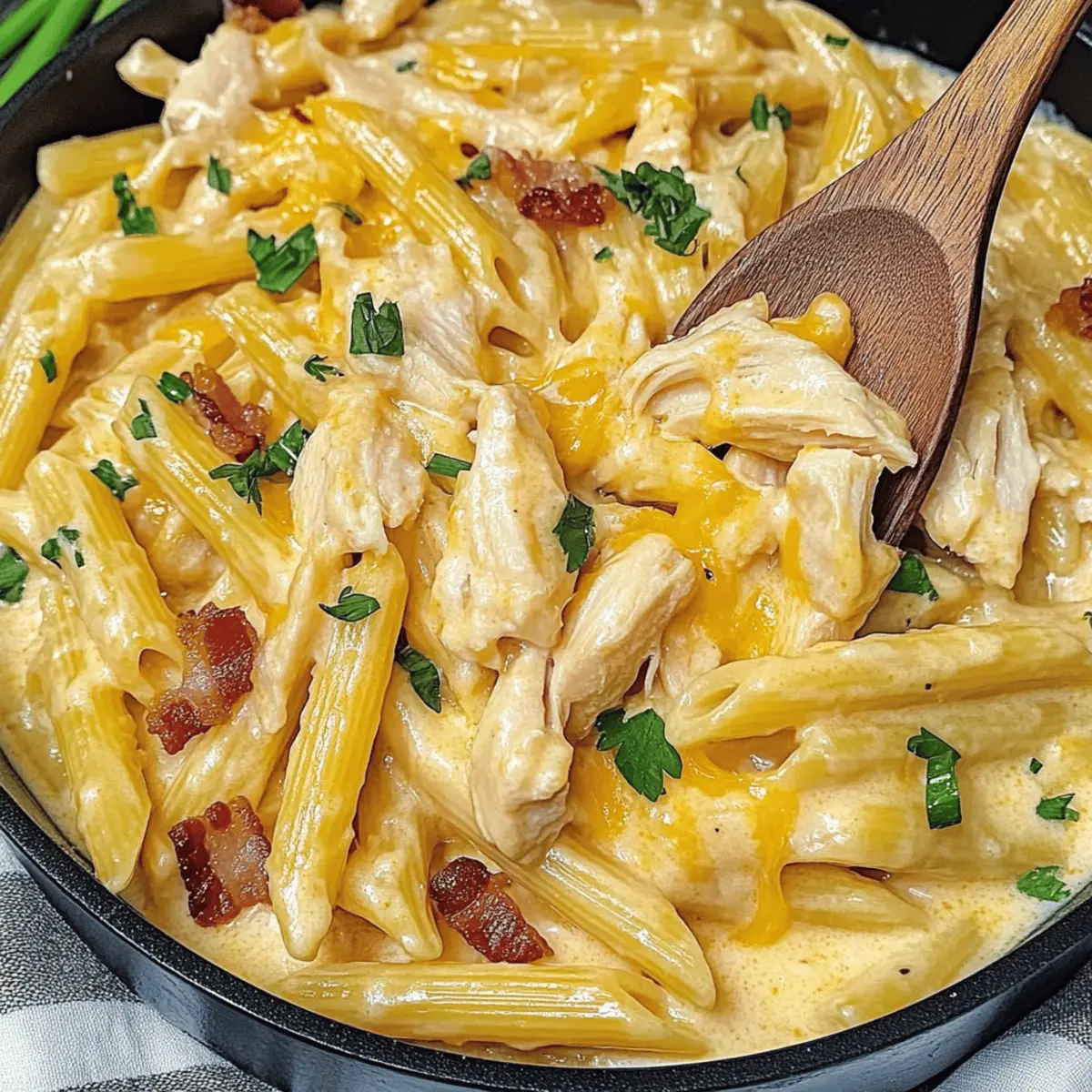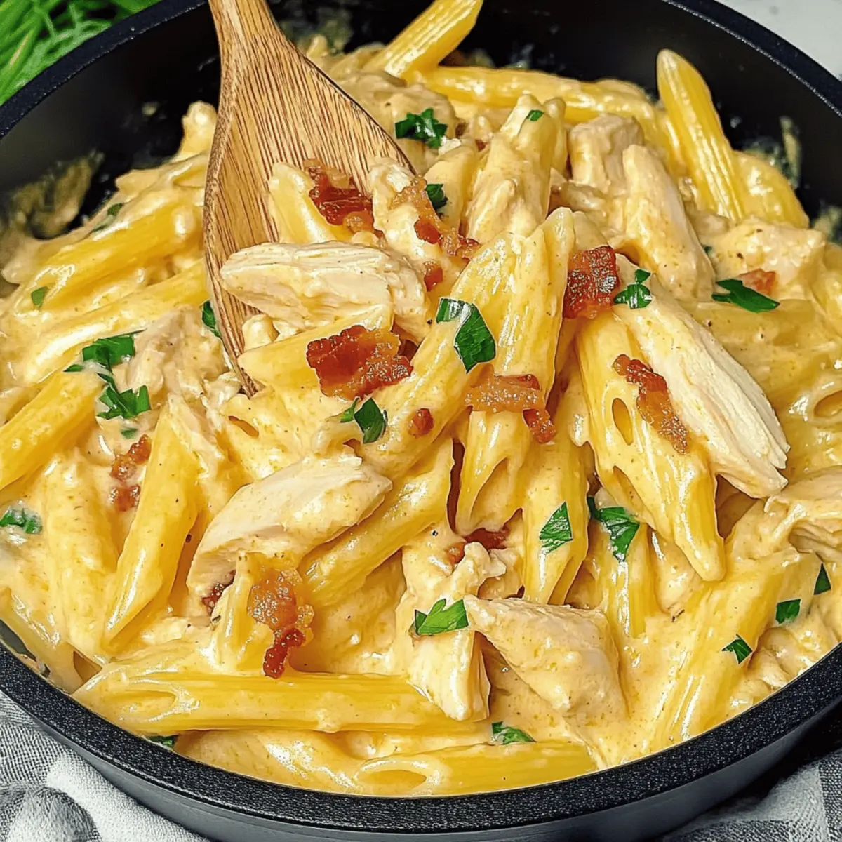 Enjoy the warmth of home with this creamy chicken penne, featuring savory bacon and cheese, perfect for family dinners.