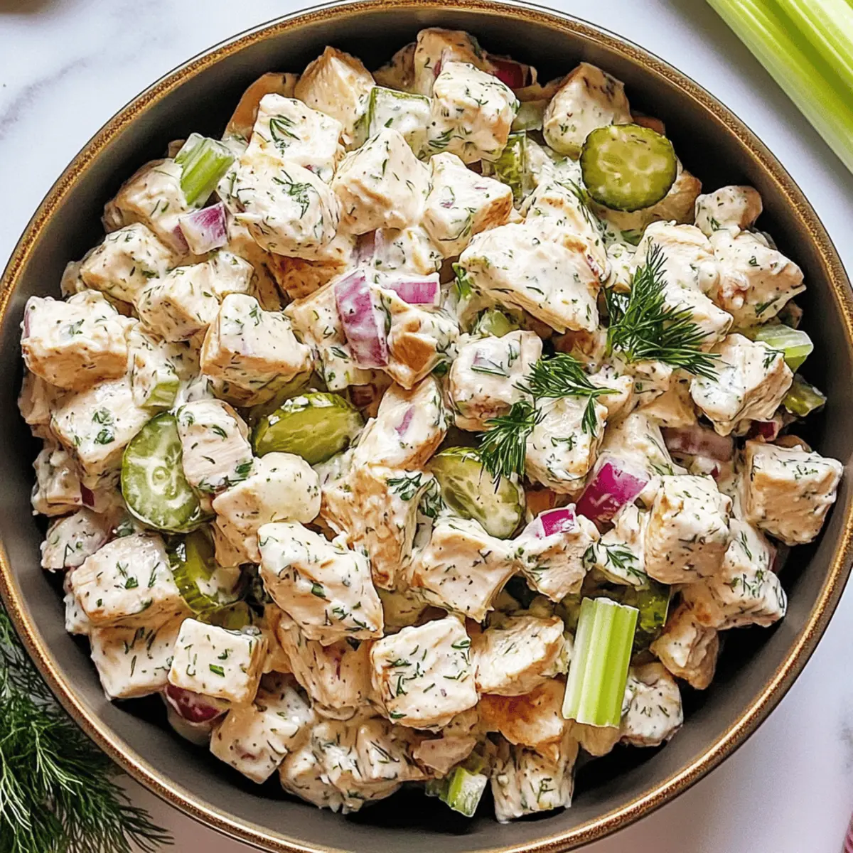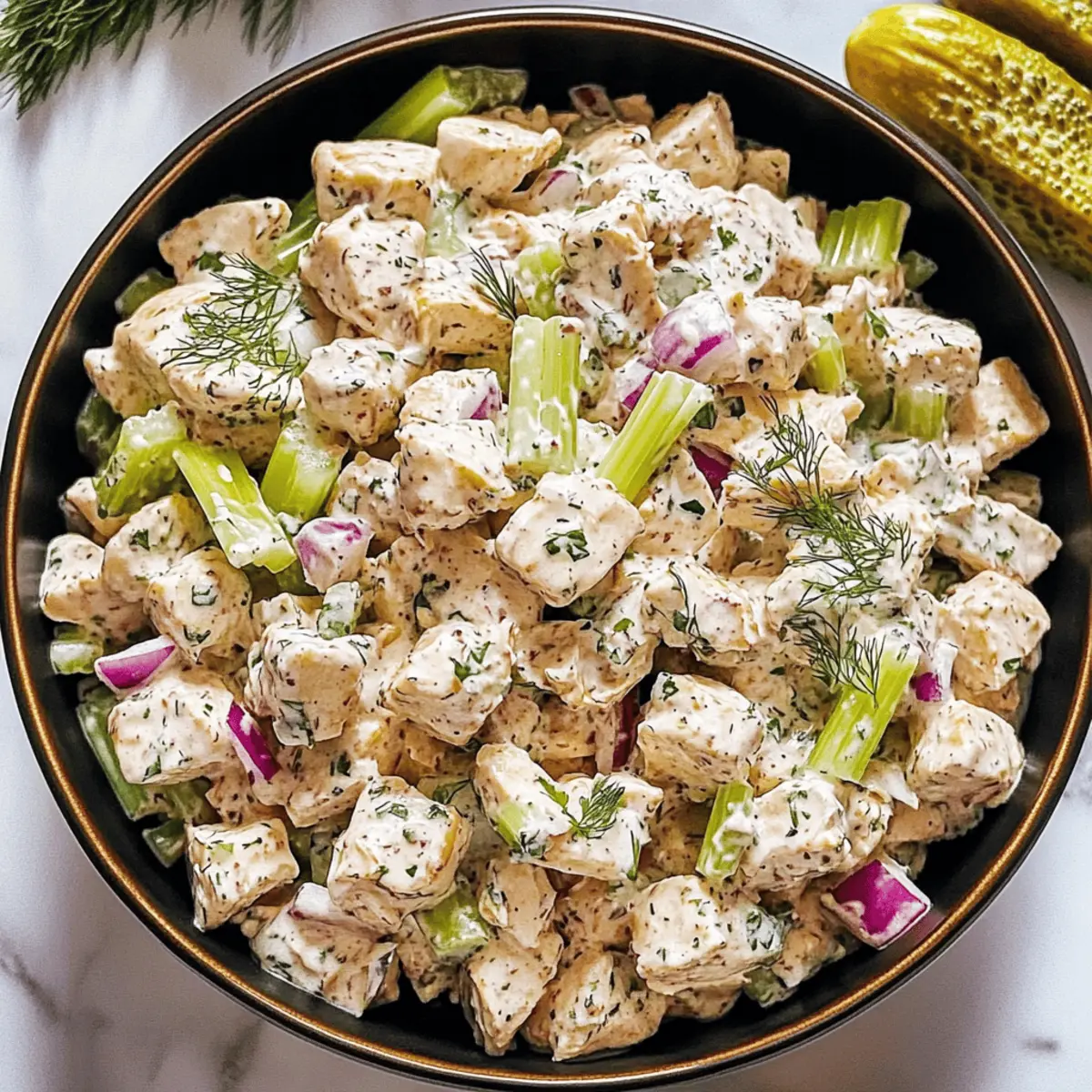 - Pour the cubed chicken into the dressing and stir gently to coat. Add chopped celery, red onion, and dill pickles, mixing well.