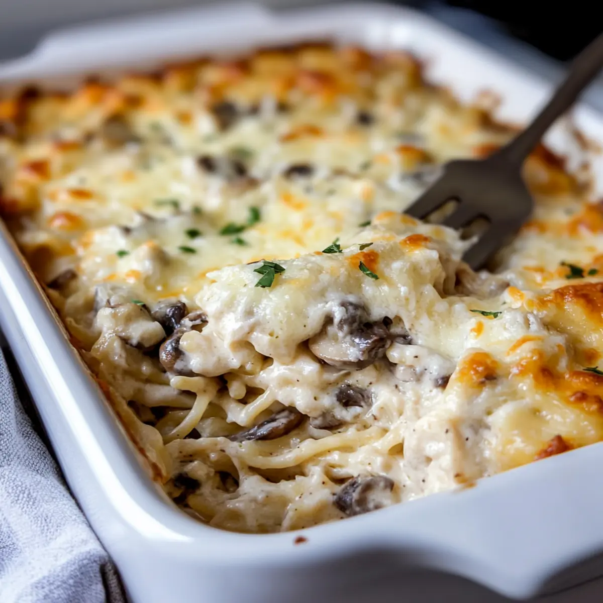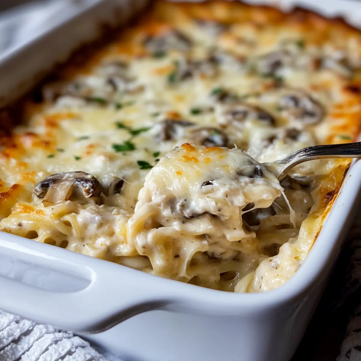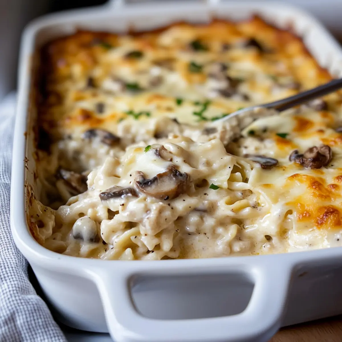 - In a casserole dish, spread ½ cup of the creamy sauce on the bottom. Layer half of the noodles, chicken, and mushroom mixture. Repeat layers, finishing with sauce on top.