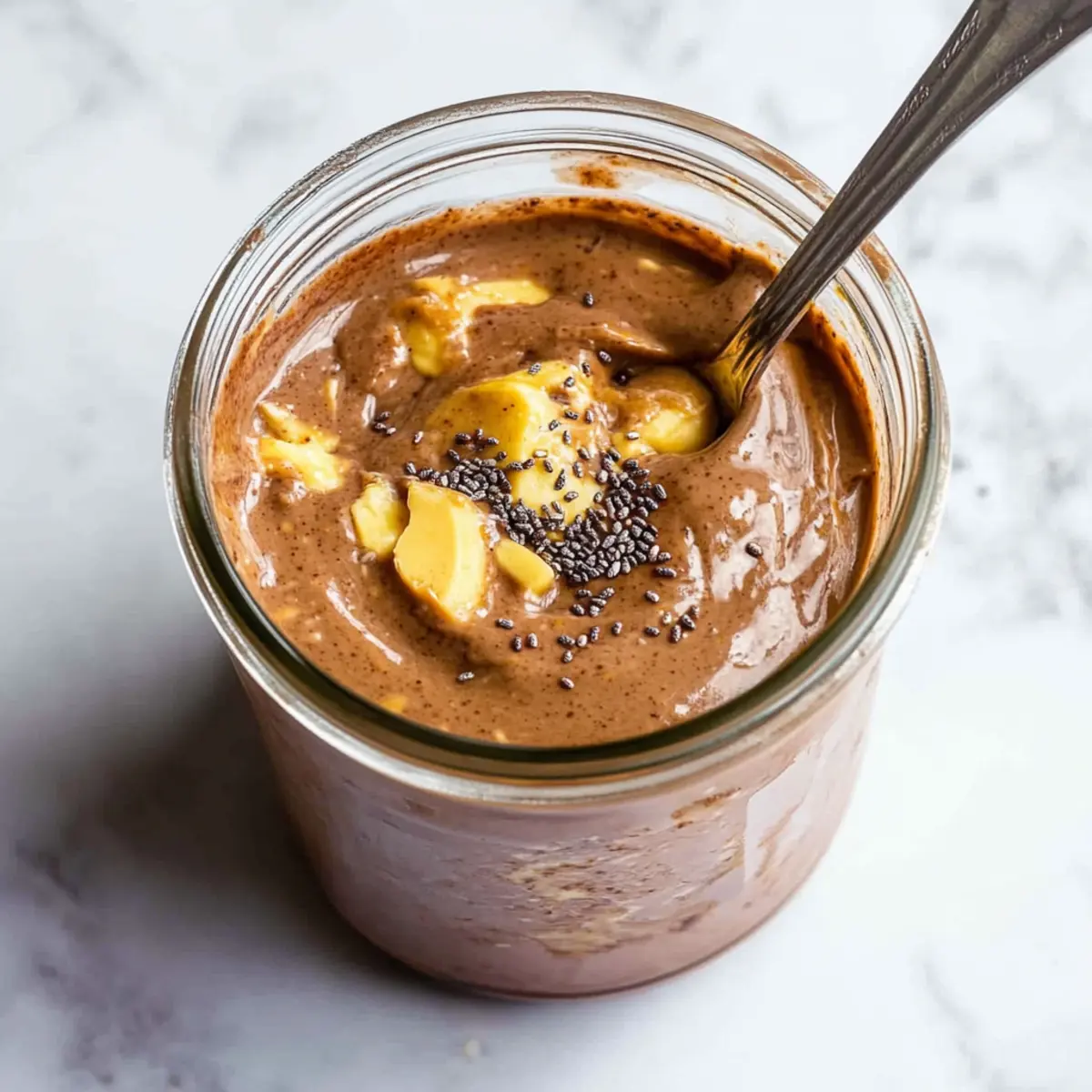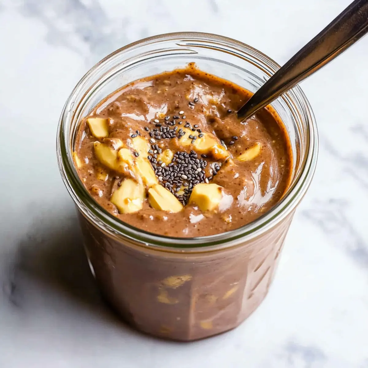 Spoon the rich mixture into a jar or container with a tight-fitting lid. Use a spatula to scrape down the sides of the bowl, ensuring you capture all the creamy goodness. Leave a little headspace at the top of the jar as the oats will expand as they soak, making this a perfect container for your healthy chocolate peanut butter overnight oats.