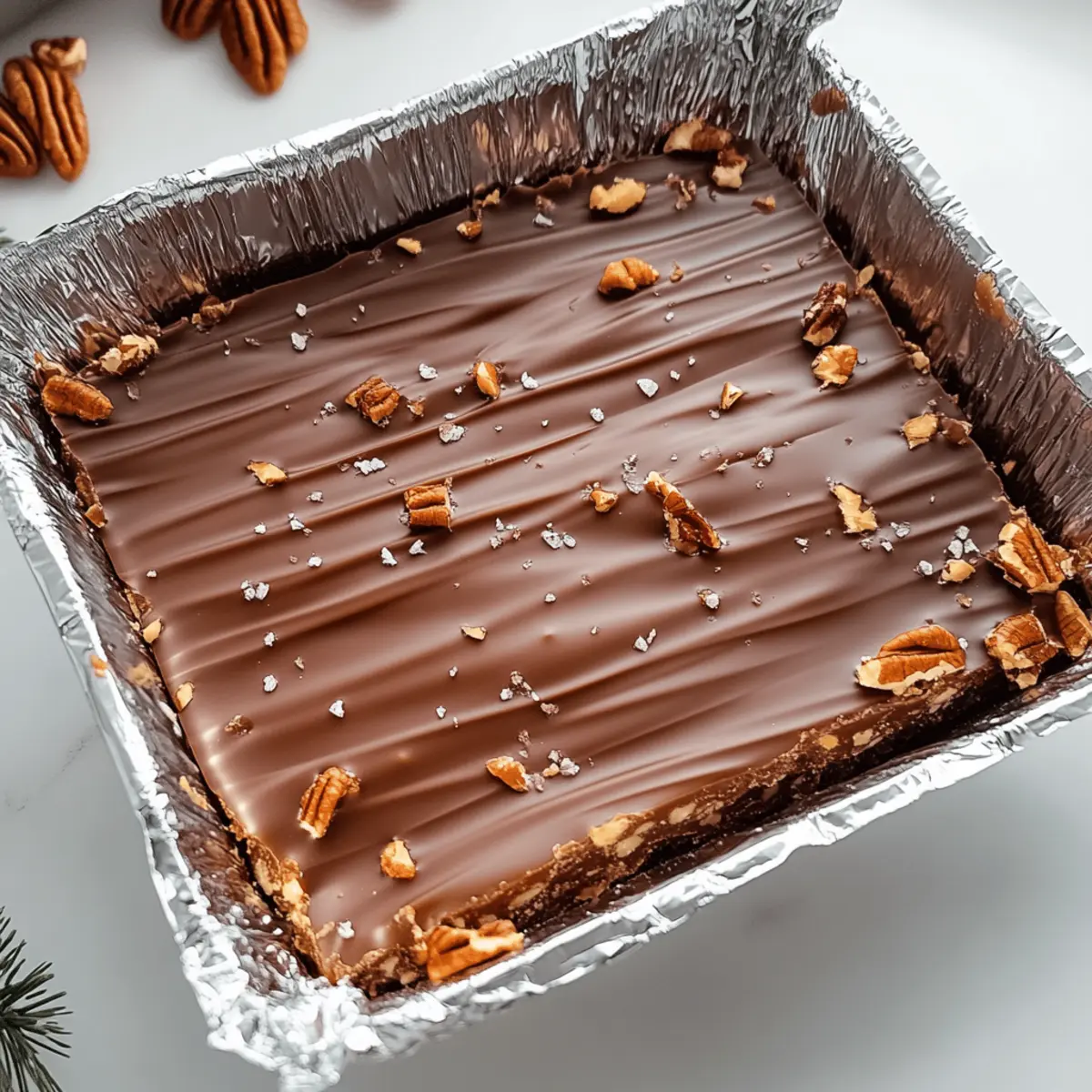 - Gently swirl melted chocolate over the caramel and sprinkle with chopped pecans and flaked sea salt if desired.