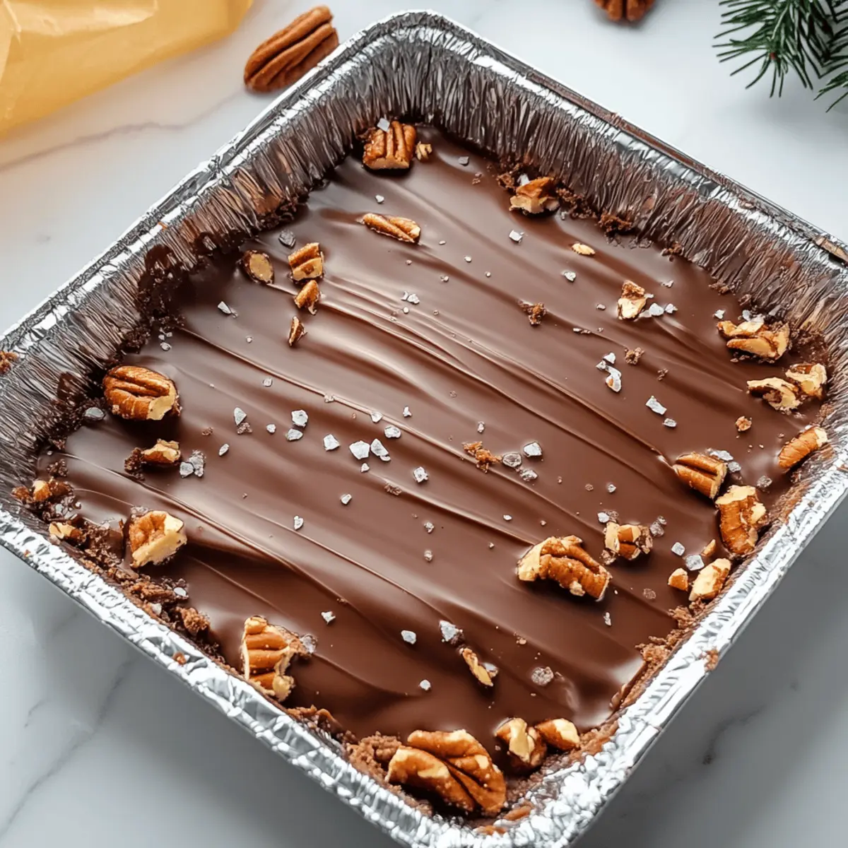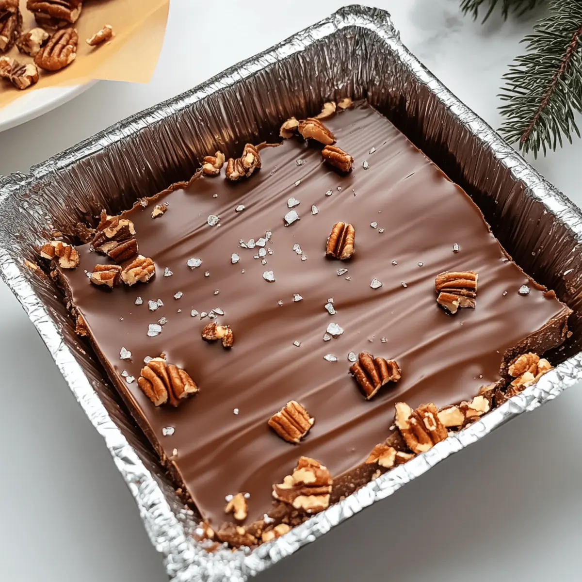 After the chocolate has softened, use a spatula to gently swirl it over the caramel. Add extra finely chopped pecans on top for added texture and crunch. For those who enjoy a burst of flavor, sprinkle a bit of flaked sea salt as well. This creates a lovely contrast to the sweetness of the toffee and chocolate.