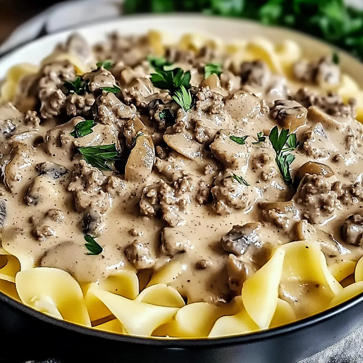 To serve, plate the egg noodles and generously spoon the creamy Hamburger Stroganoff over the top. For a burst of color and freshness, sprinkle with chopped fresh parsley. This final touch enhances both presentation and flavor, turning your dish into a cozy family meal.