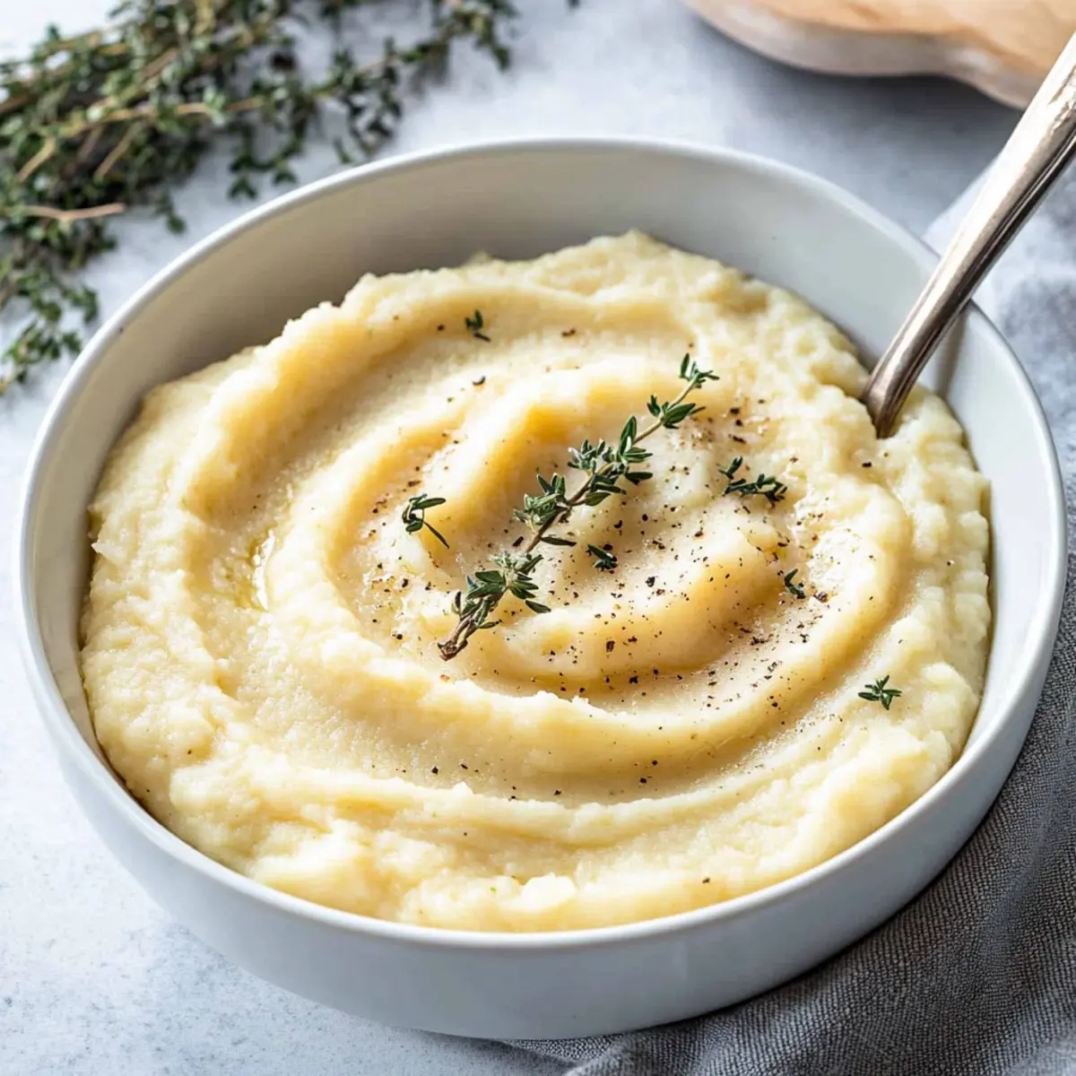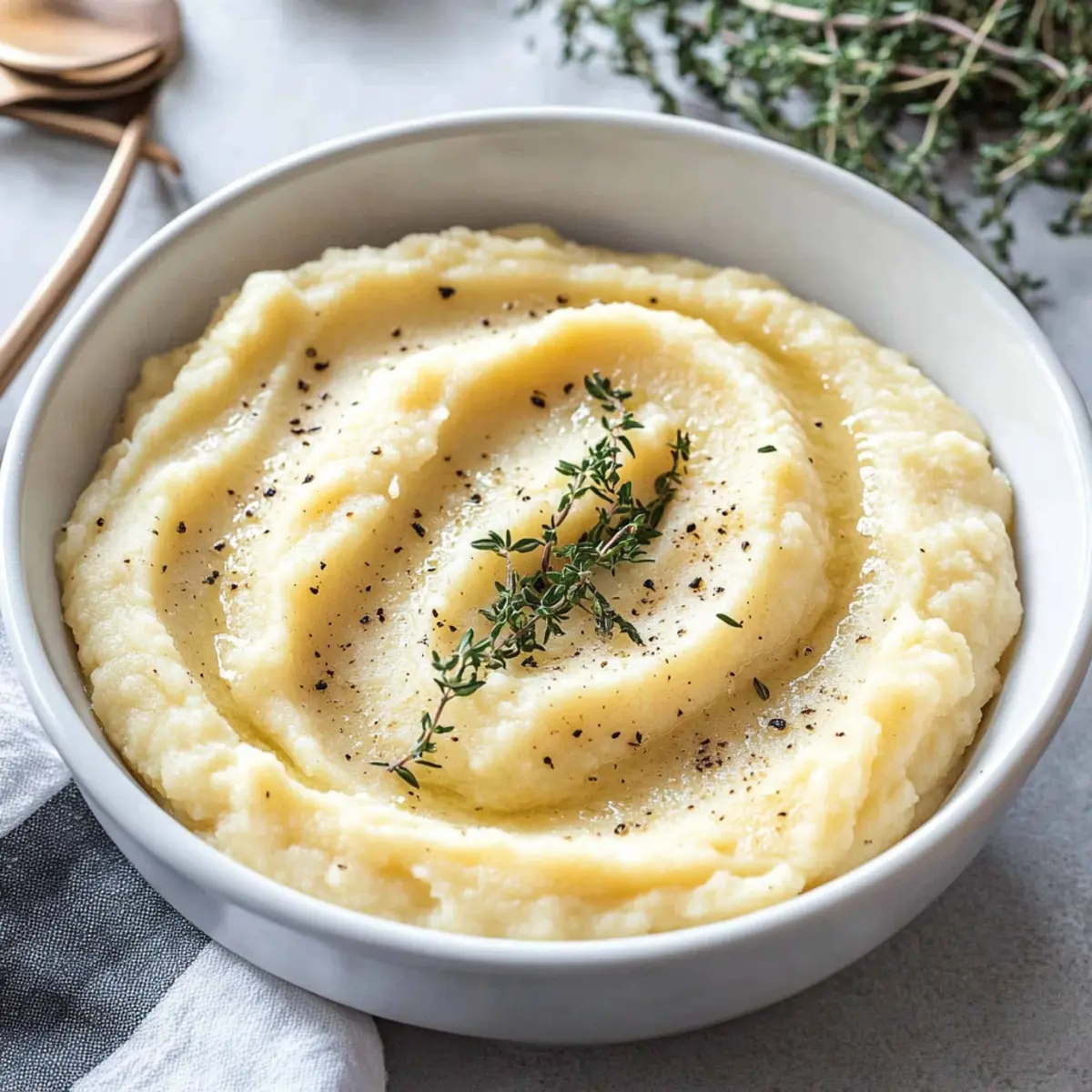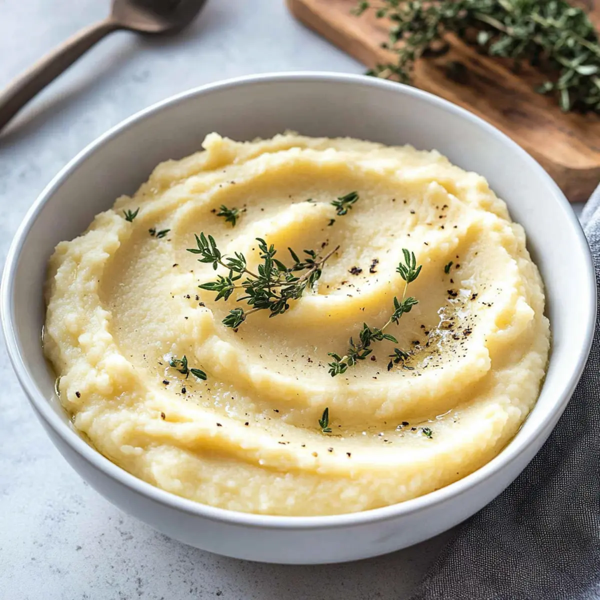 After achieving a velvety blend, stir in ¾ teaspoon of kosher salt, freshly ground black pepper to taste, and a handful of fresh thyme leaves. Mix well to ensure the flavors meld beautifully. Serve warm as the perfect side dish to complement your main course.