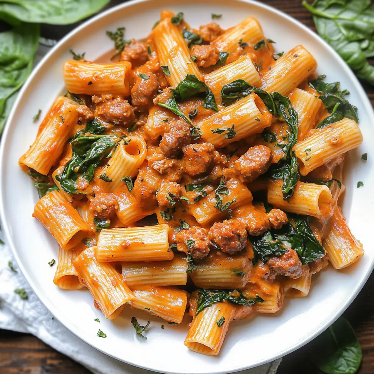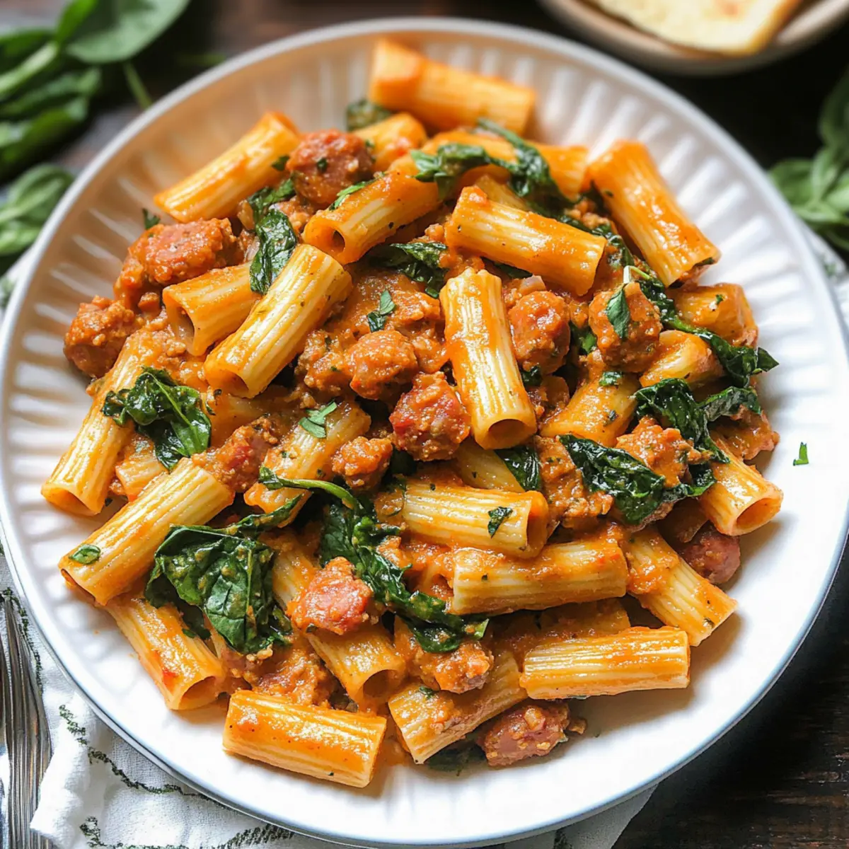 Uncover the skillet and add 5 ounces of fresh spinach. Stir it into the pasta and sauce mixture, cooking for an additional 2 minutes until the spinach wilts and brightens the dish. This adds both nutritional value and a pop of color to your Creamy Sausage Rigatoni.