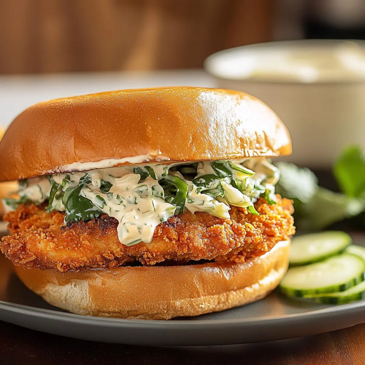 Once the chicken is cooked and the coating sauce is ready, coat each chicken breast in the sauce for an extra layer of flavor. Place the sauce-coated chicken onto your sliced bread rolls, and generously pile on the tangy cucumber salad. Finish with a drizzle of your sandwich sauce for added creaminess, then close the sandwiches and serve immediately, enjoying the vibrant flavors of your Crispy Cilantro Lime Chicken Sandwich!