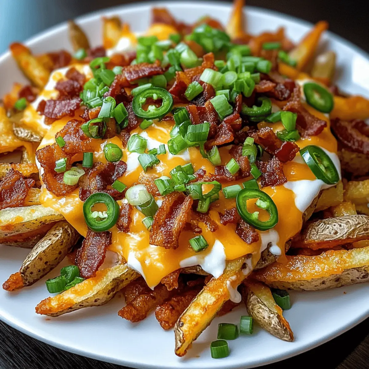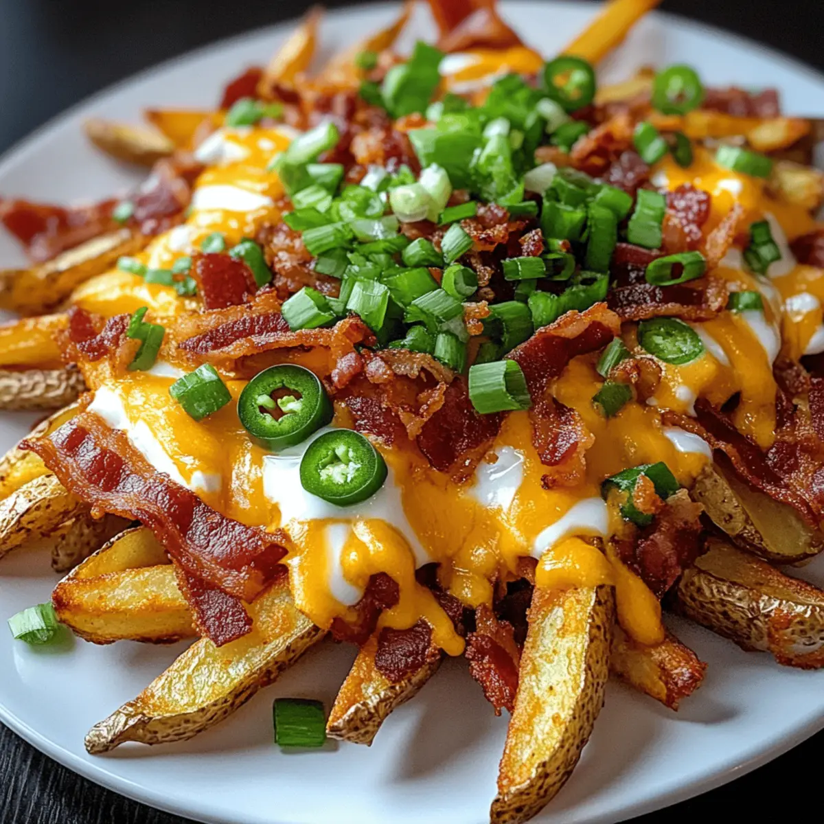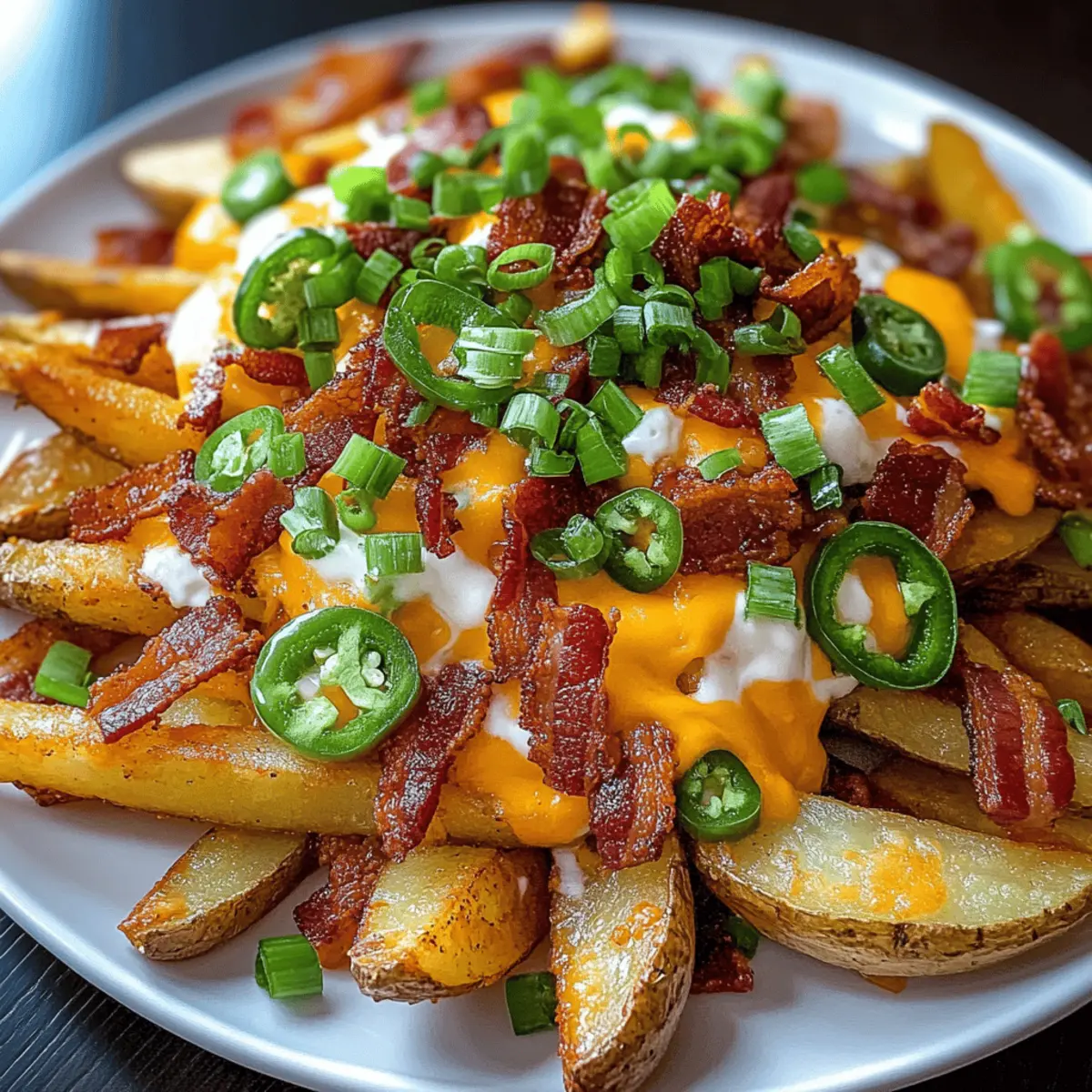 After the cheese has melted, remove the fries from the oven and top them with crispy bacon bits, fresh green onions, and sliced jalapeños for an extra kick. Pop them back in the oven for 5 more minutes to warm the toppings through while maintaining that delightful crunch.