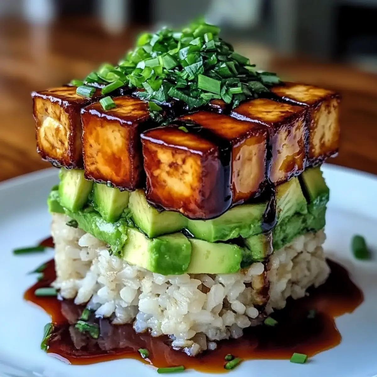 A delightful crispy teriyaki tofu and avocado rice stack packed with flavor and nutrients, perfect for dinner.