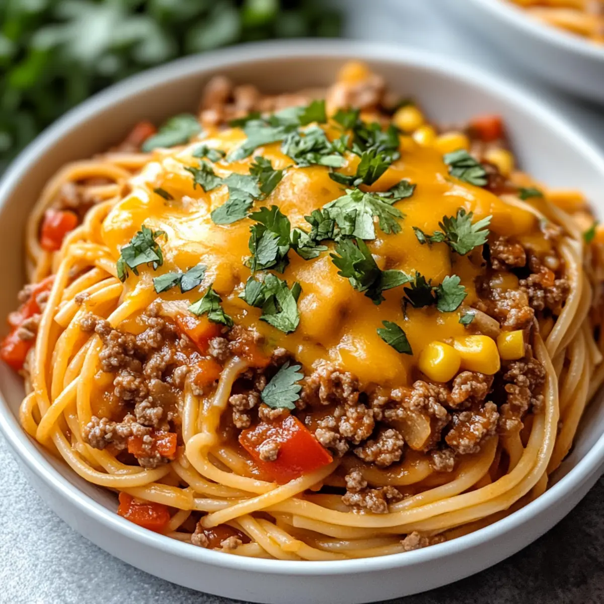 CrockPot Taco Spaghetti is a fantastic candidate for meal prep, saving you precious time during busy weeknights! You can brown the lean ground beef and mix it with the diced bell pepper, crushed tomatoes, salsa, drained corn, taco seasoning, and chicken broth up to 24 hours in advance. Just store the mixture in an airtight container in the refrigerator to keep it fresh. When you’re ready to serve, simply transfer the mixture to the slow cooker, add the uncooked spaghetti, and follow the cooking instructions as outlined. Your family will enjoy a delicious meal that’s just as comforting and flavorful as if it were made fresh!
