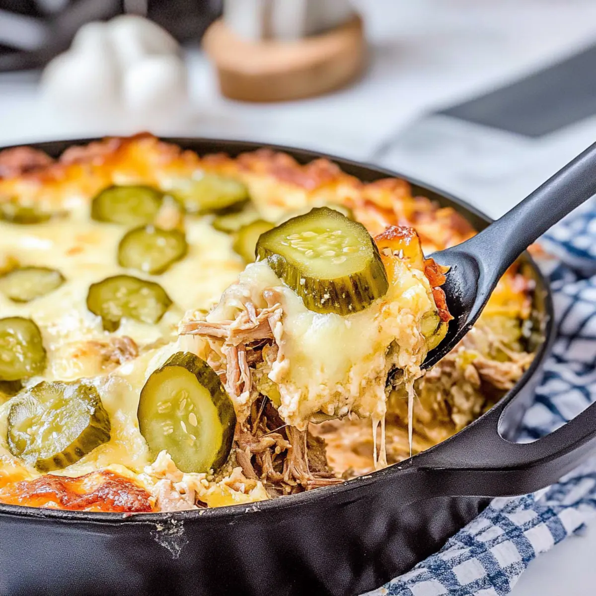 - Fold in the prepared pulled pork, diced ham, half of the pickles, and half of the shredded Swiss cheese, mixing for another 2-3 minutes.