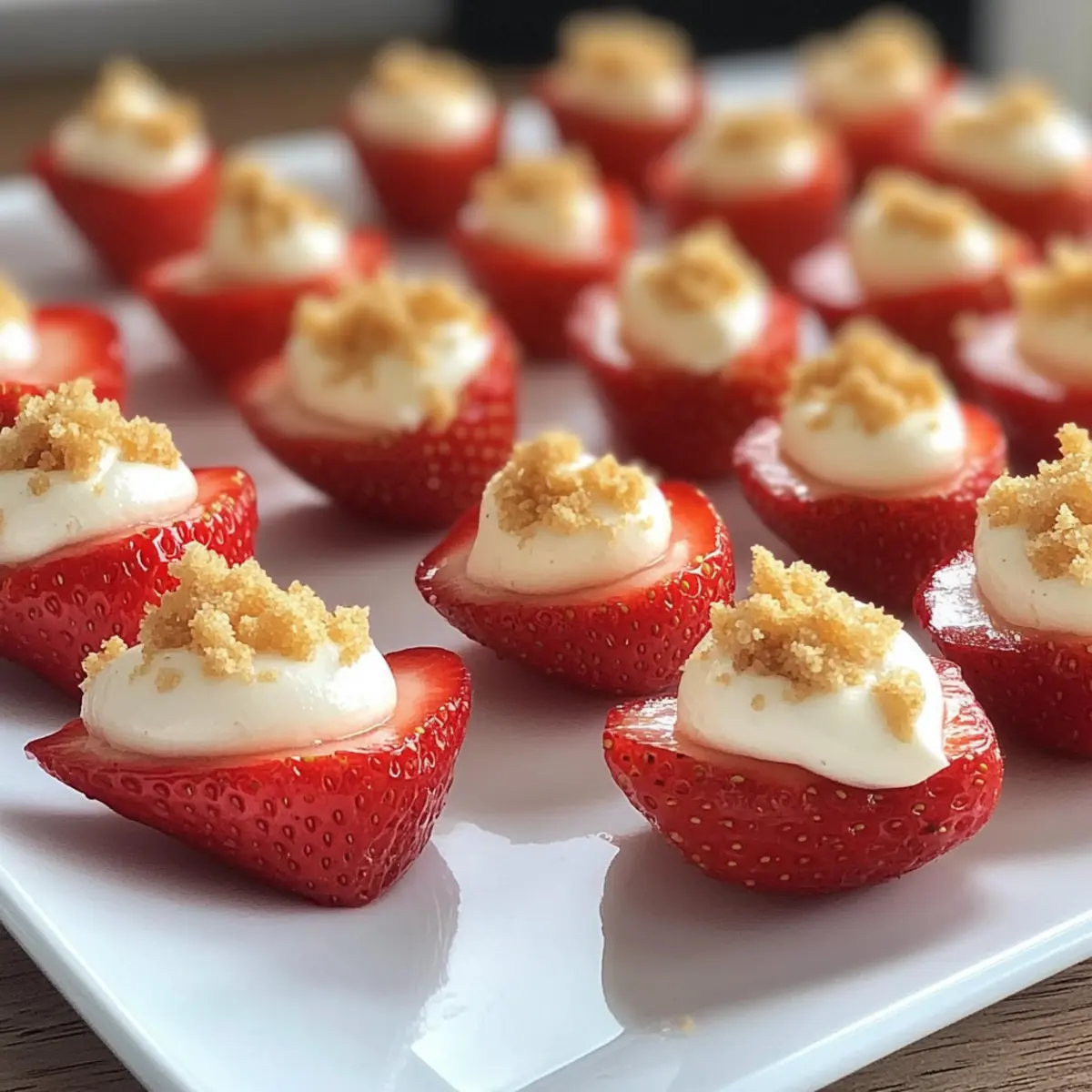 Sprinkle the tops of the filled strawberries with graham cracker crumbs for that classic cheesecake crunch. This adds not just flavor but also a delightful texture contrast. Serve the deviled strawberries immediately for the best presentation, or refrigerate them for up to an hour to chill slightly before serving. Enjoy this fun and festive dessert with friends and family!