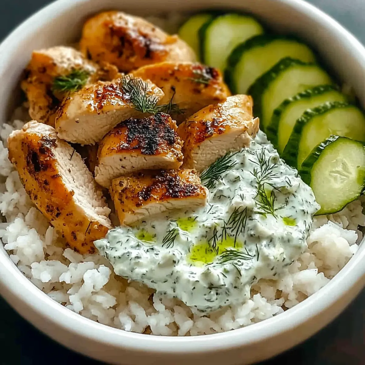 - Spoon tzatziki mixture over the chicken and rice evenly.