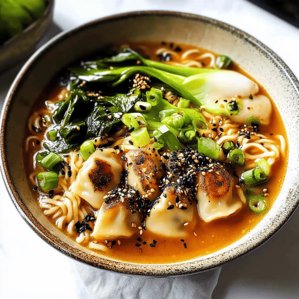 Divide the cooked ramen noodles into bowls, ladle the rich broth and dumplings over them, and add the bok choy. Garnish with chopped green onions, a sprinkle of crushed red pepper, and black sesame seeds for added flavor and crunch. Enjoy your vibrant and comforting soup!
