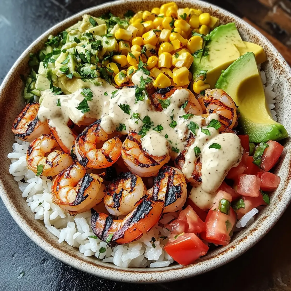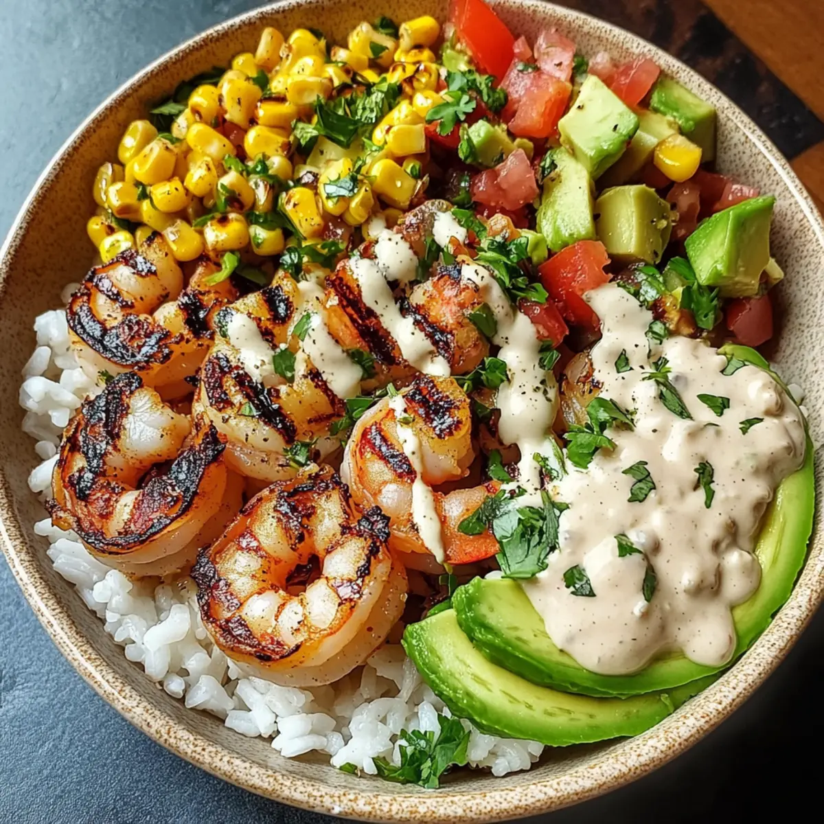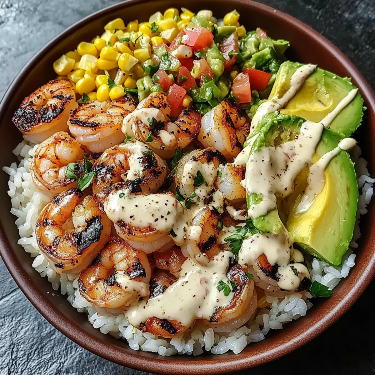Delight in this Grilled Shrimp Bowl featuring smoky shrimp, fresh corn salsa, and creamy avocado, perfect for a summer dinner.