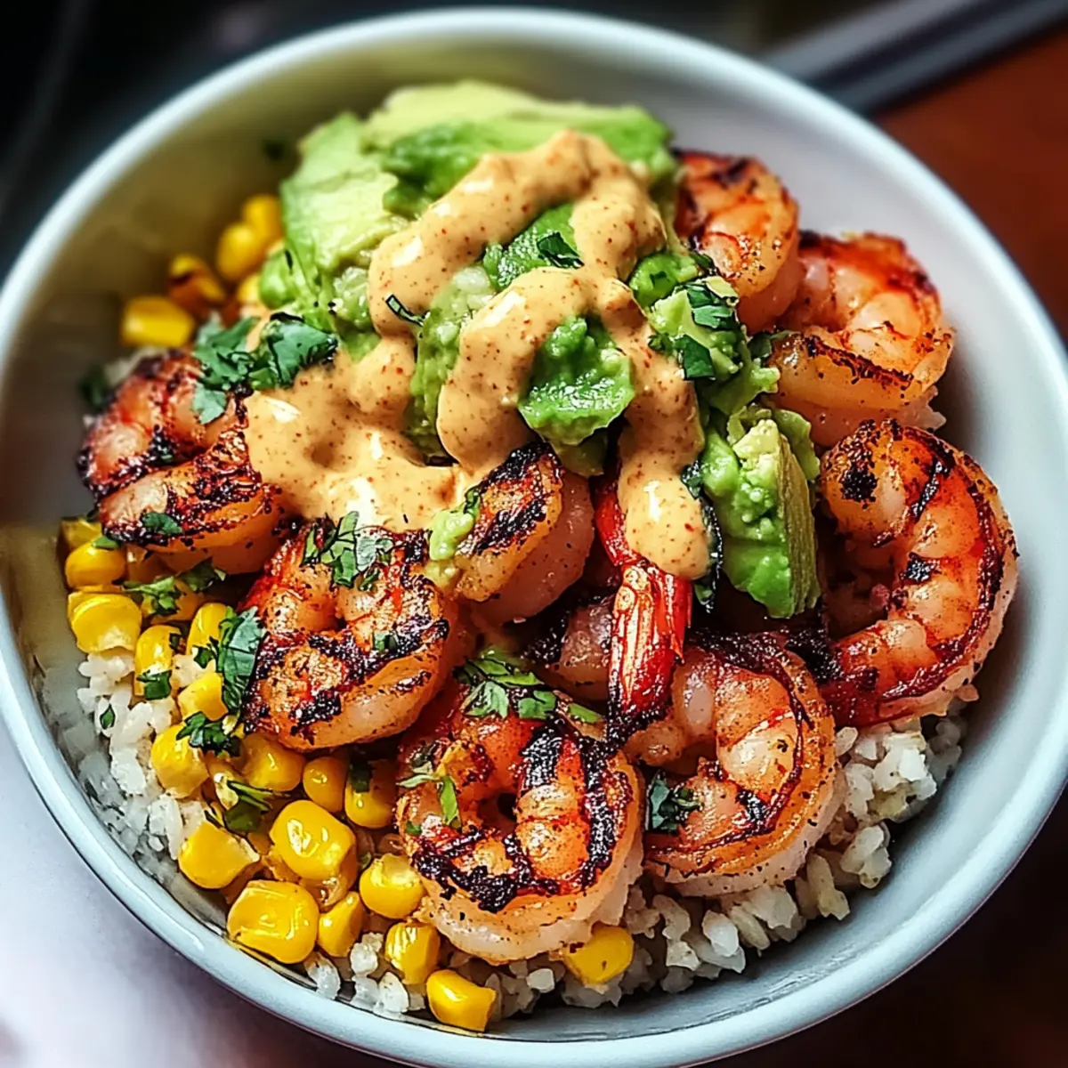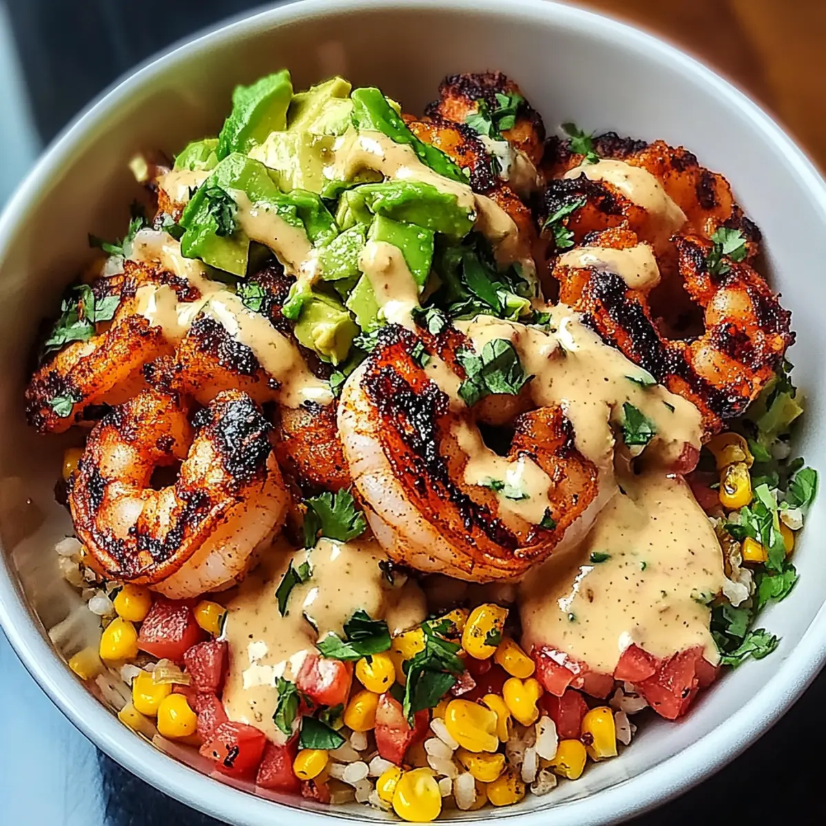 - Assemble bowl: Start with rice or quinoa, then layer corn salsa, avocado mash, grilled shrimp, and drizzle with creamy sauce. Garnish with cilantro.