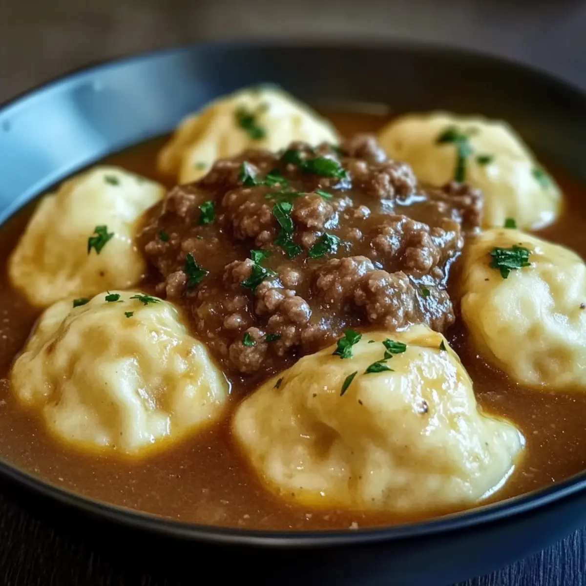 Once the dumplings are fully cooked, optionally sprinkle with fresh parsley for a pop of color and freshness. Serve the comforting Ground Beef and Dumplings warm, ensuring to scoop up both dumplings and rich gravy for a dish that’s not just a meal, but a hug on a plate.