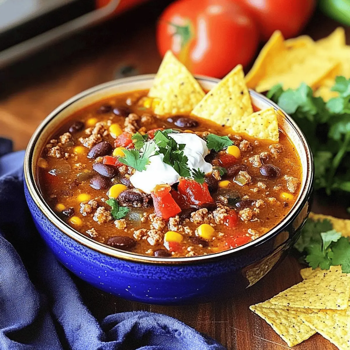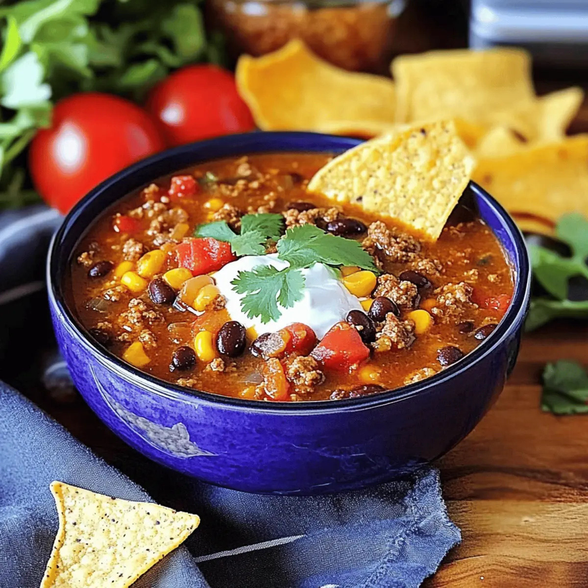 Once the soup has simmered to perfection, ladle it into bowls, and don’t forget the fun toppings! Garnish with sour cream, shredded cheese, and fresh cilantro for a burst of color and flavor. Serve alongside crunchy tortilla chips for dipping, enhancing the comforting experience of your hearty Ground Beef Taco Soup.