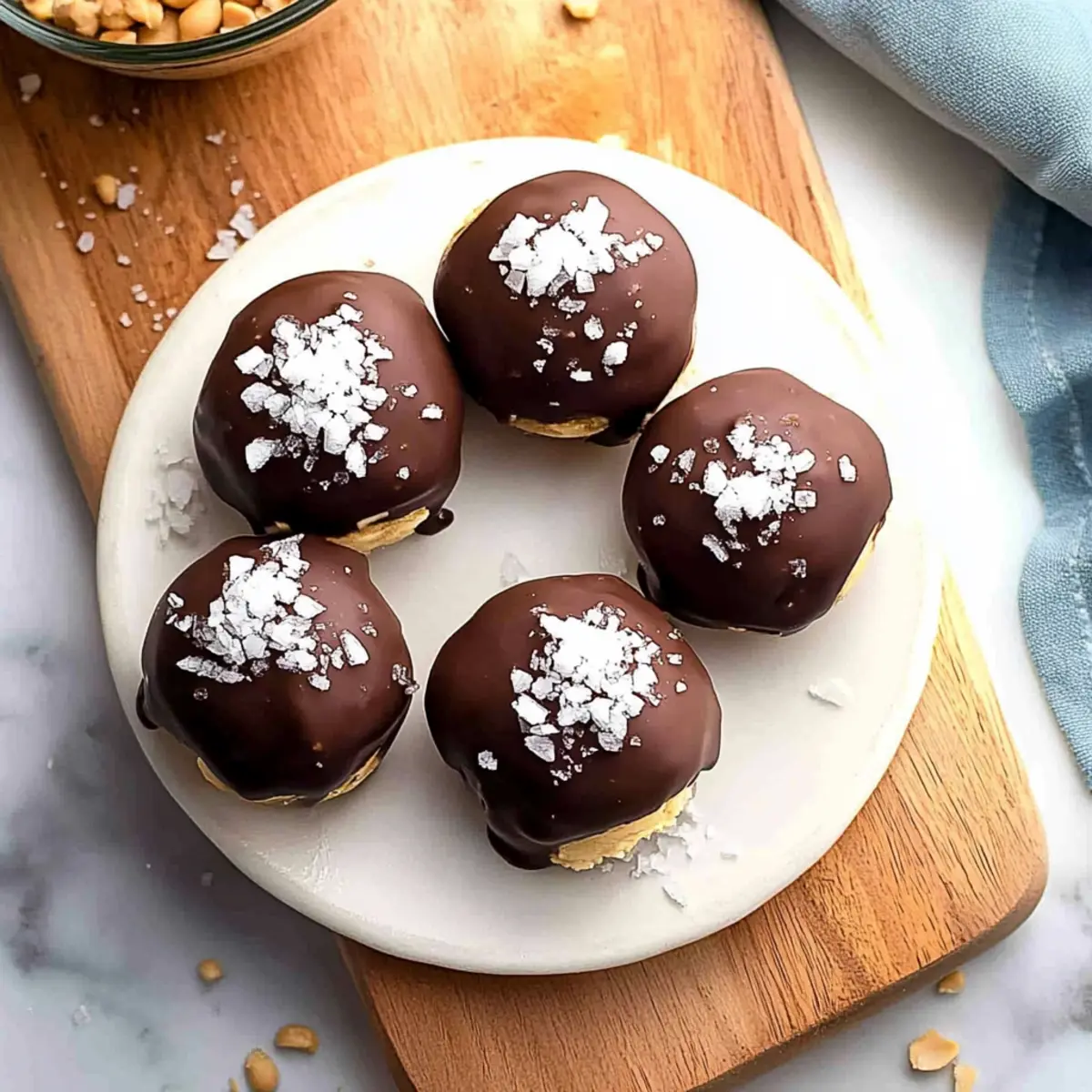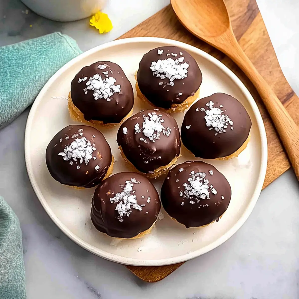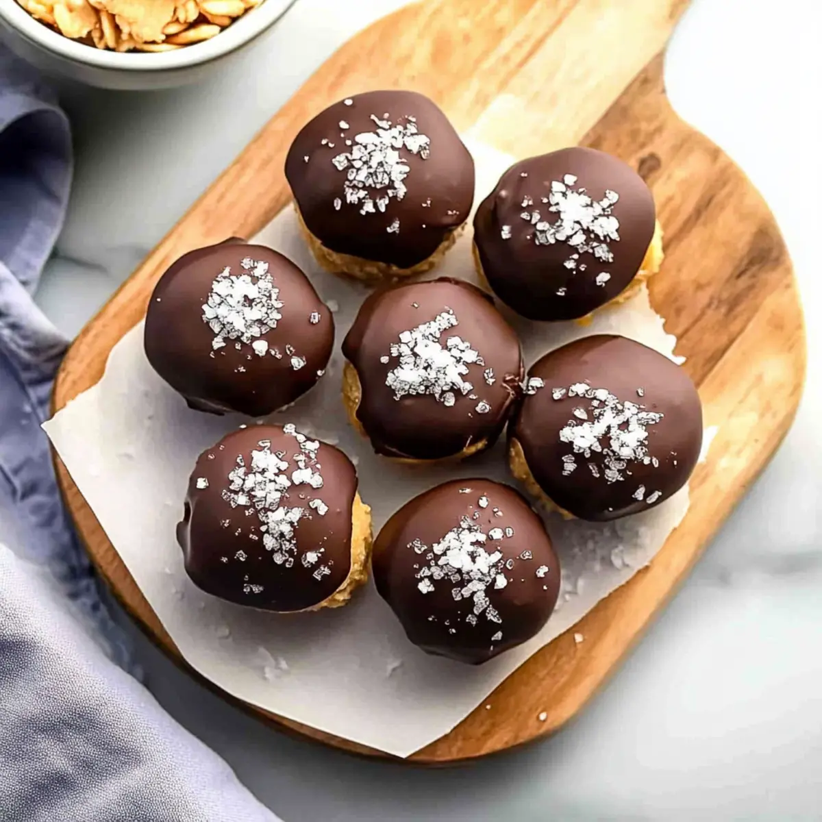 Sprinkle a pinch of flaky sea salt over the chocolate-coated bites while the chocolate is still wet, adding a touch of flavor enhancement. Once all the bites are coated, place the tray back in the fridge to allow the chocolate to set for about 20-30 minutes. You will know they are ready when the chocolate is firm and has a glossy finish.