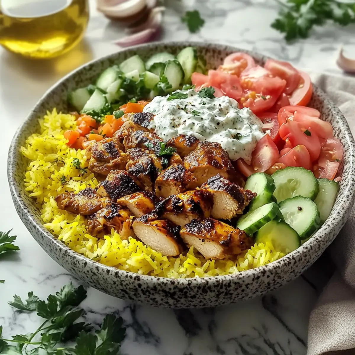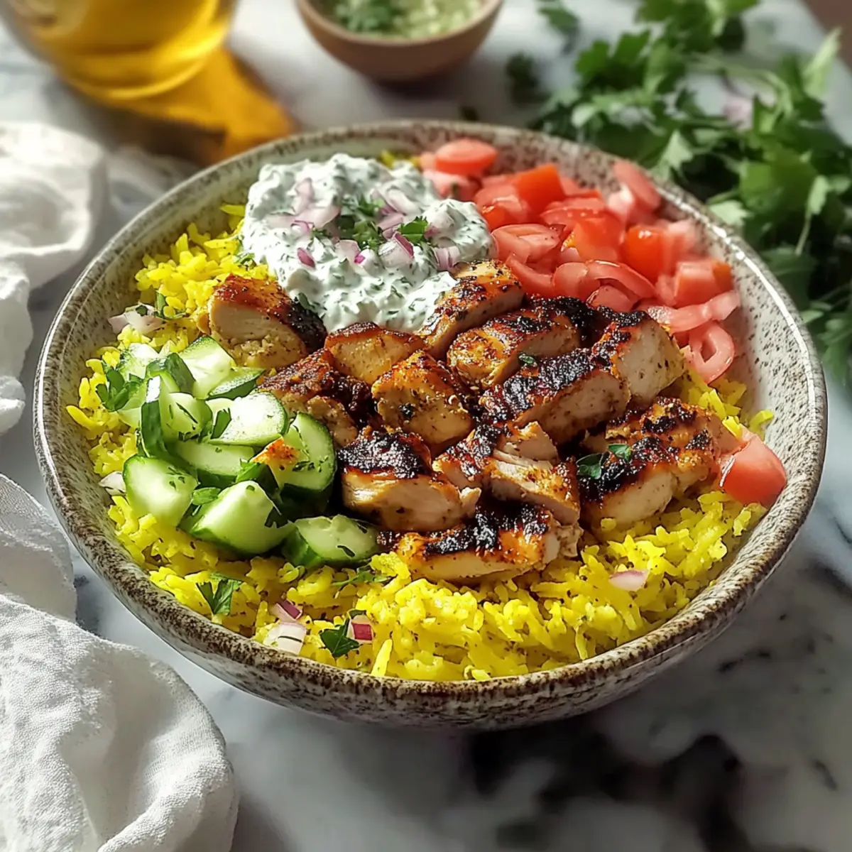 - Assemble bowls with turmeric rice, roasted chicken, cucumber salad, tzatziki, and serve with warm flatbreads.