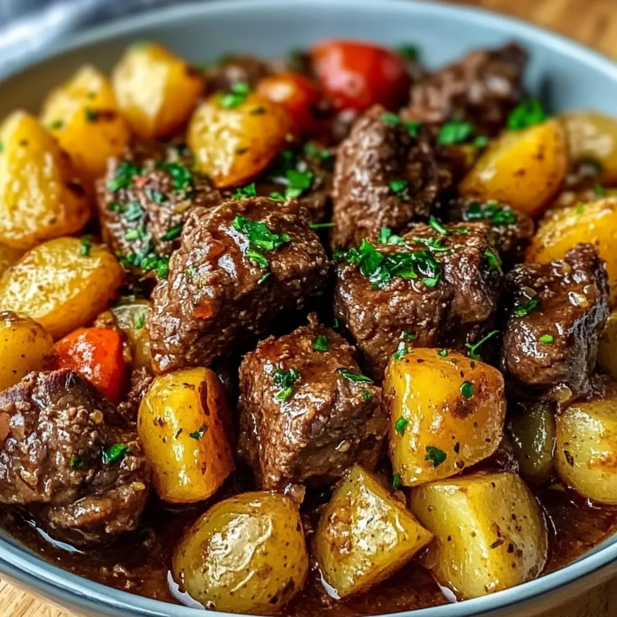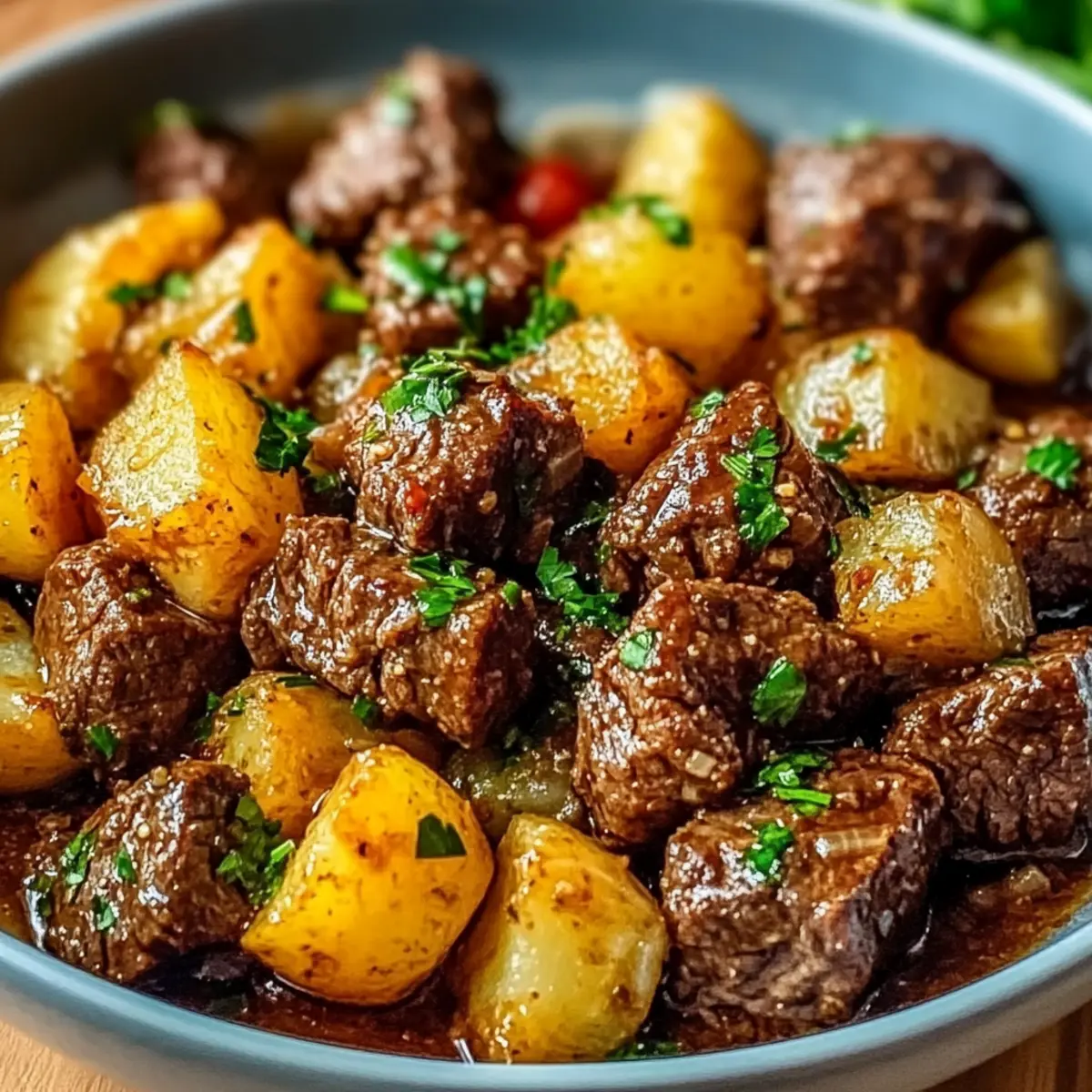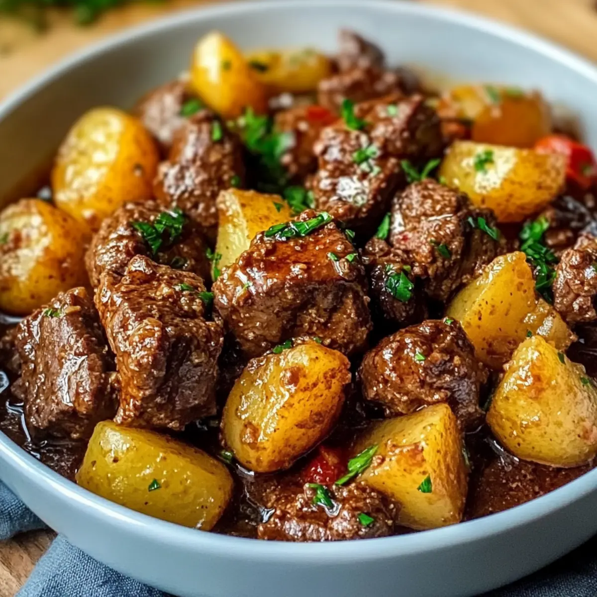 4. Pour the garlic butter mixture over the beef and potatoes, stirring to coat evenly.