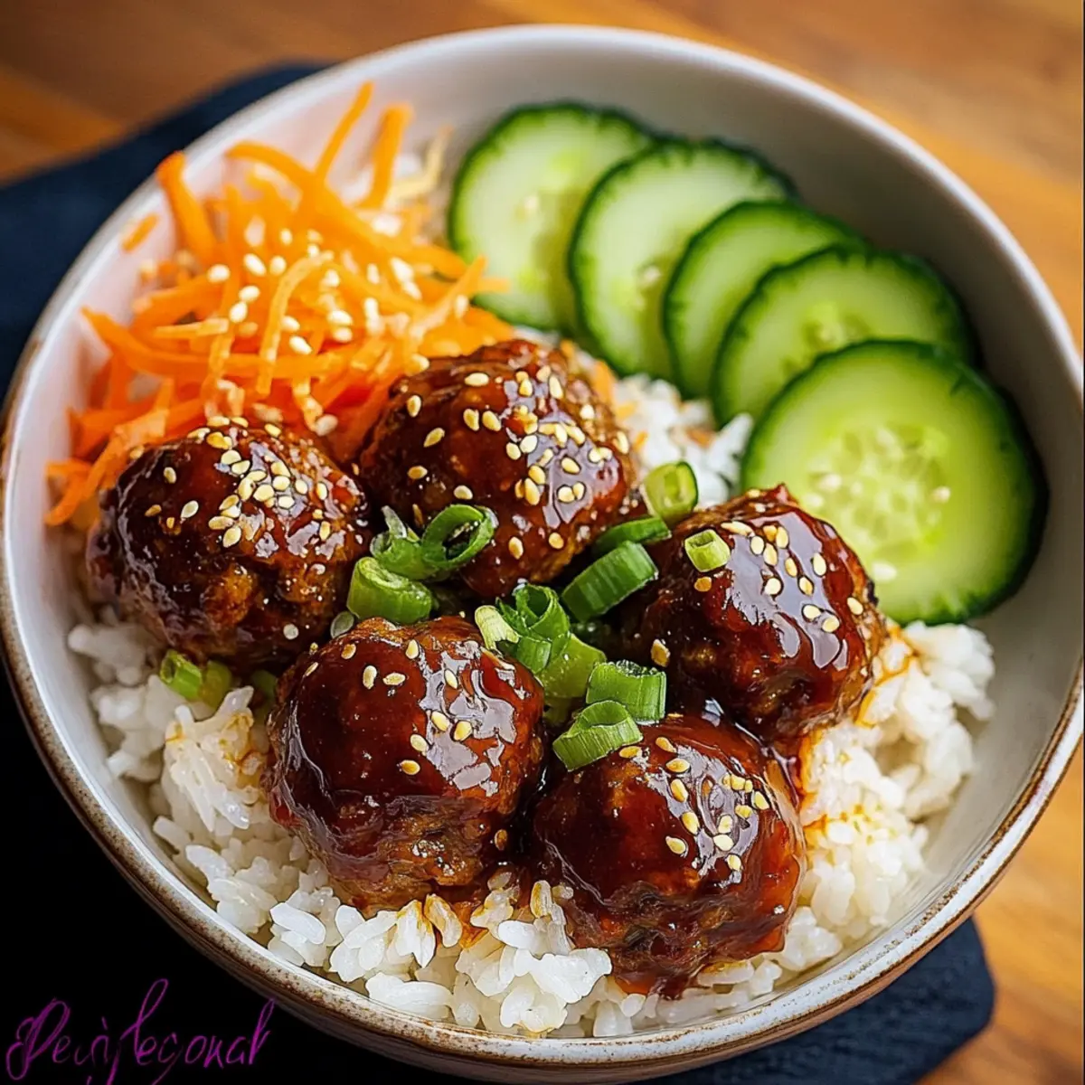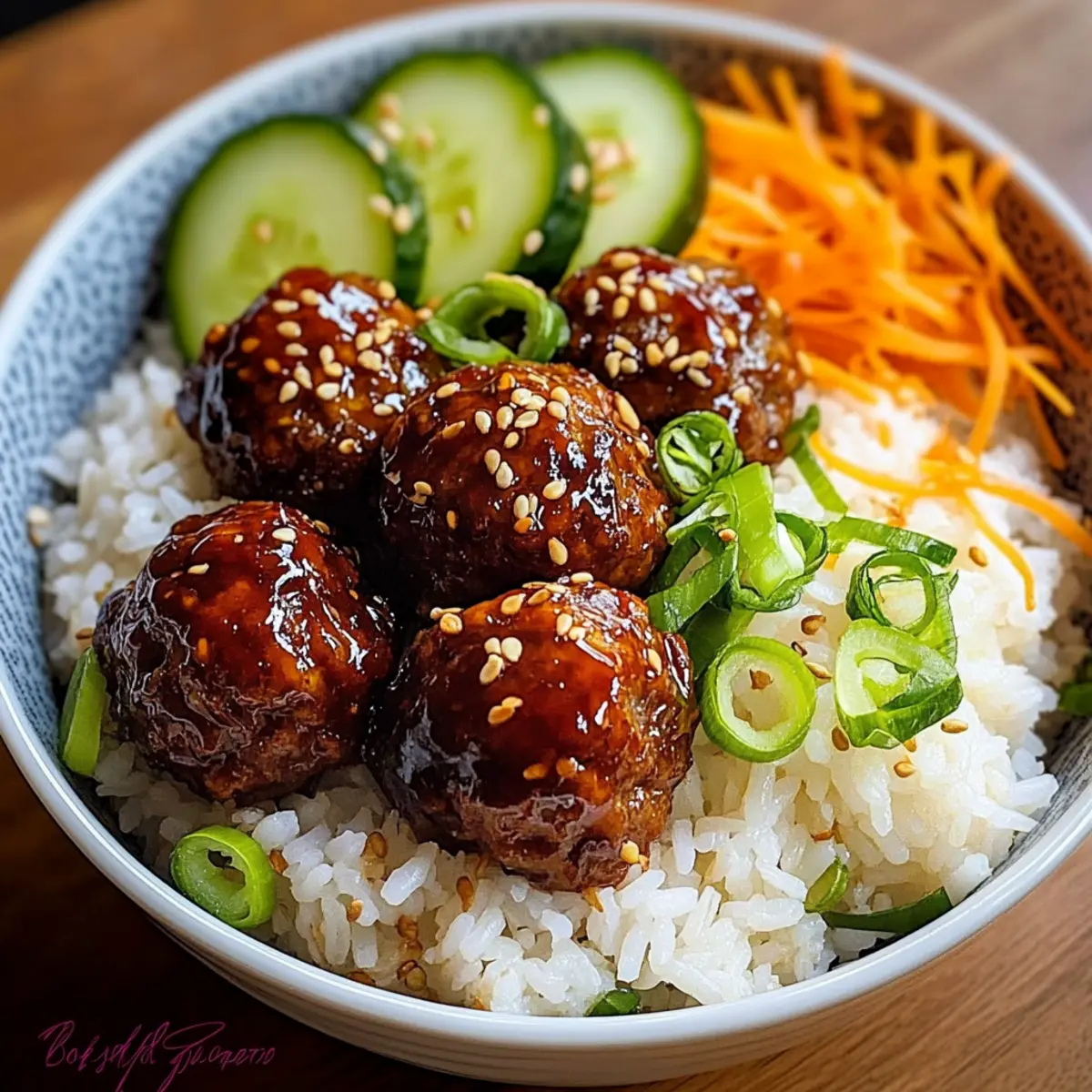 - Assemble bowls with jasmine rice, glazed meatballs, shredded carrots, and cucumber. Drizzle with spicy mayo and garnish with green onions and sesame seeds.