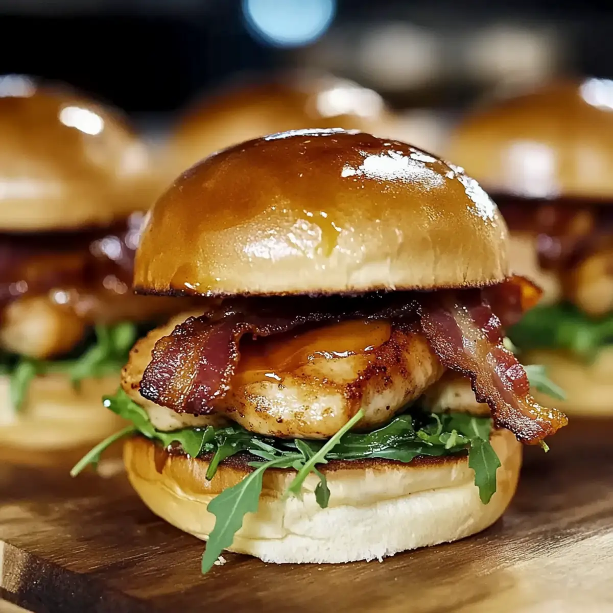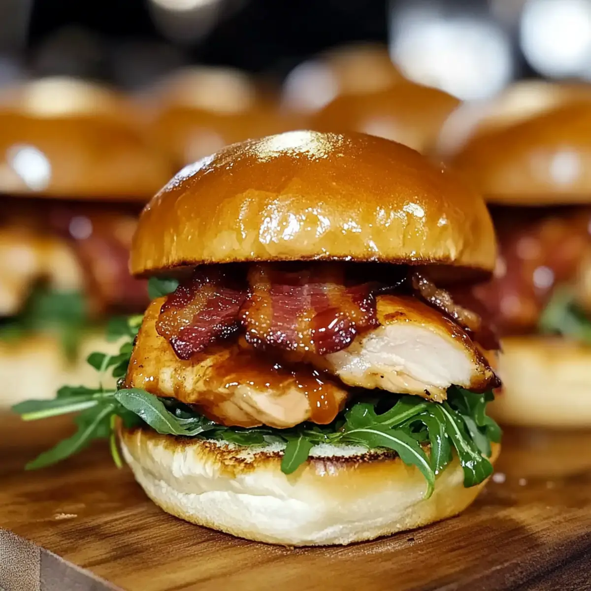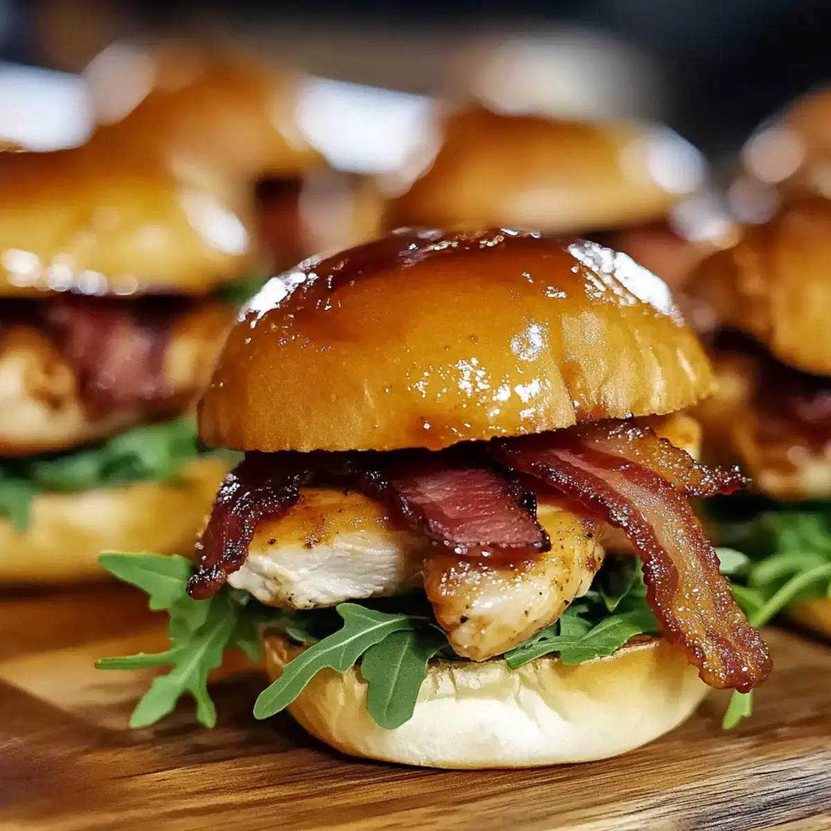 - Preheat oven to 350°F (175°C). Toast the slider buns for 5 minutes. Assemble by placing arugula on the bottom half of each bun, then the glazed chicken, followed by the bacon, and top with the other bun.