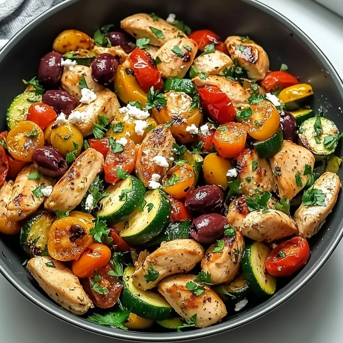 Return the cooked chicken to the skillet with the sautéed vegetables. Add the halved cherry tomatoes, chopped sun-dried tomatoes, Kalamata olives, and sprinkle in the dried oregano, basil, thyme, along with salt and pepper to taste. Stir everything together, cooking for an additional 2-3 minutes until heated through, allowing the flavors to meld beautifully.