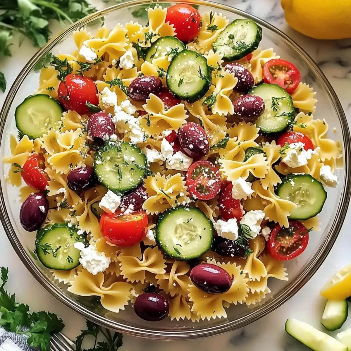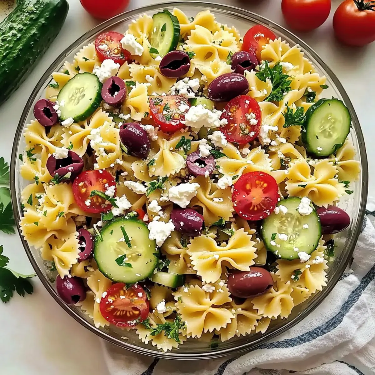 - In a large bowl, combine warm pasta and dressing. Toss to coat, then fold in cucumbers, cherry tomatoes, olives, feta, red onion, and parsley. Mix gently.