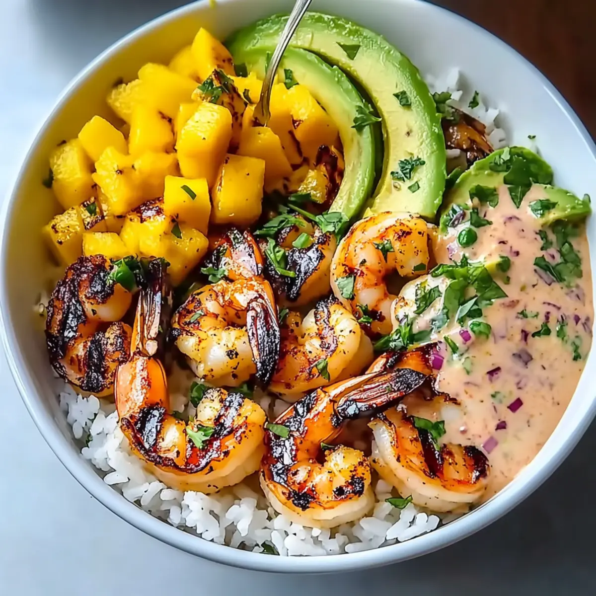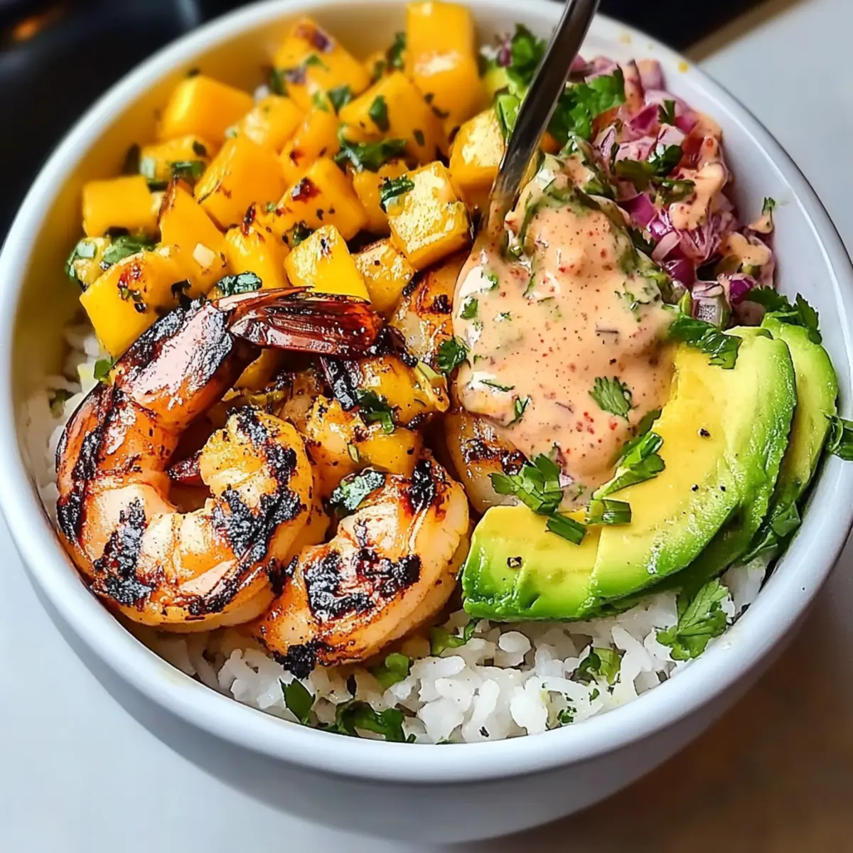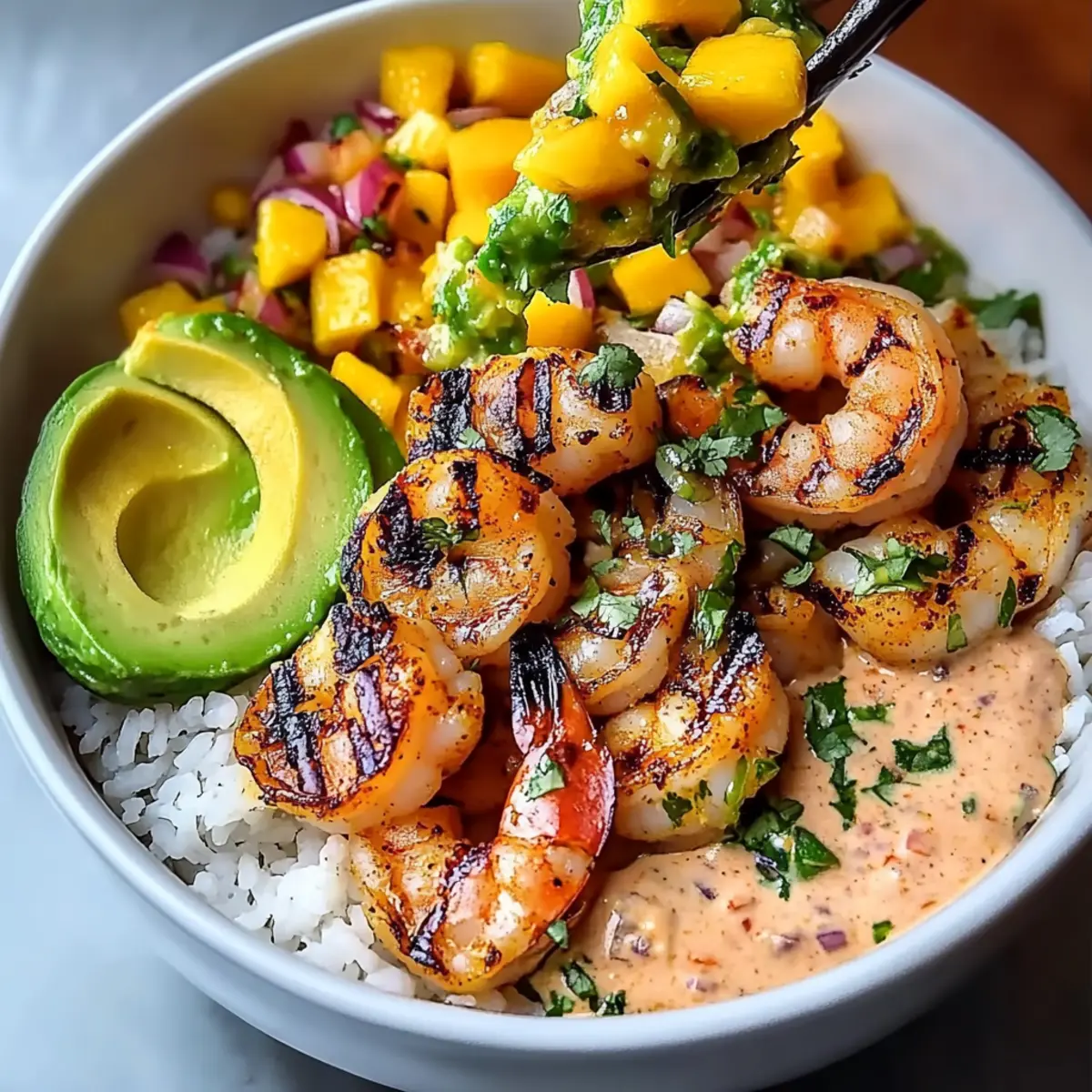 - Assemble the bowls by starting with cooked rice as the base, layering grilled shrimp on top, followed by avocado slices, mango salsa, and drizzling with lime-chili sauce.