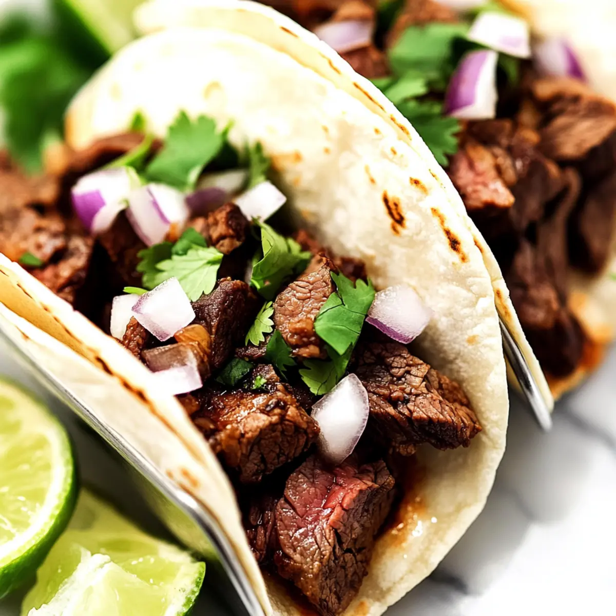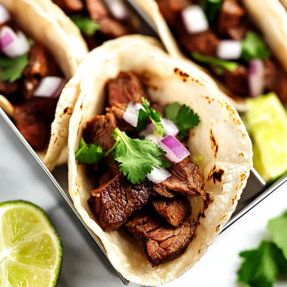 Warm your street taco size or mini corn/flour tortillas in the skillet for about 30 seconds on each side until they are soft and pliable. Fill each tortilla generously with the cooked steak, then top with freshly chopped cilantro, diced red onion, and a squeeze of lime juice to elevate those flavors.