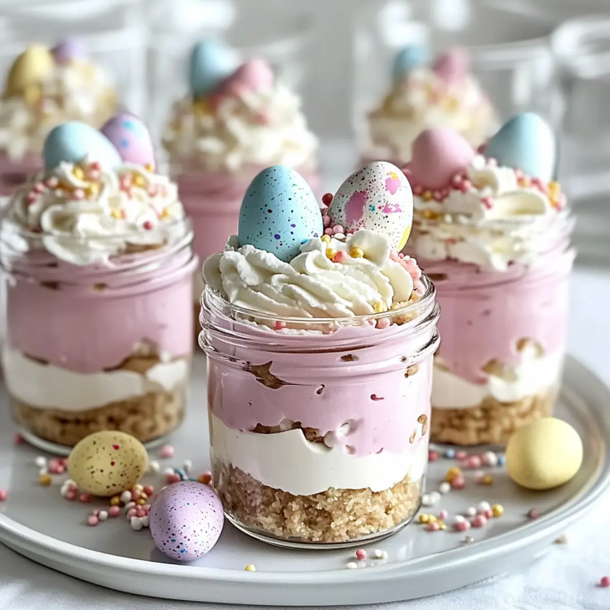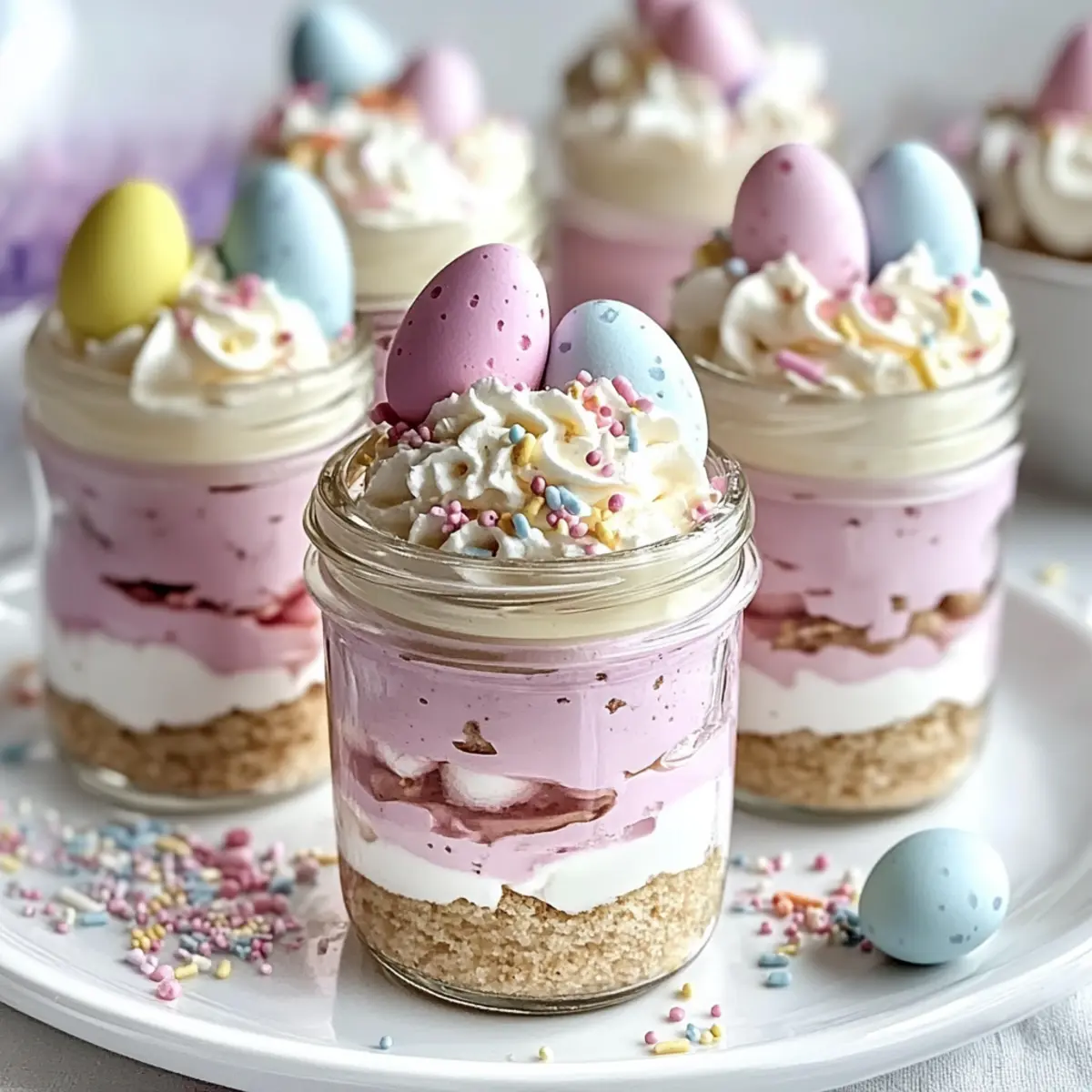 When ready to serve, pipe a generous dollop of whipped cream on top of each cheesecake jar. Garnish with pastel candy eggs and rainbow or pastel sprinkles for a cheerful finish. This final touch enhances the festive appearance of your No-Bake Easter Egg Cheesecake Jars, making them an irresistible treat for all your guests.