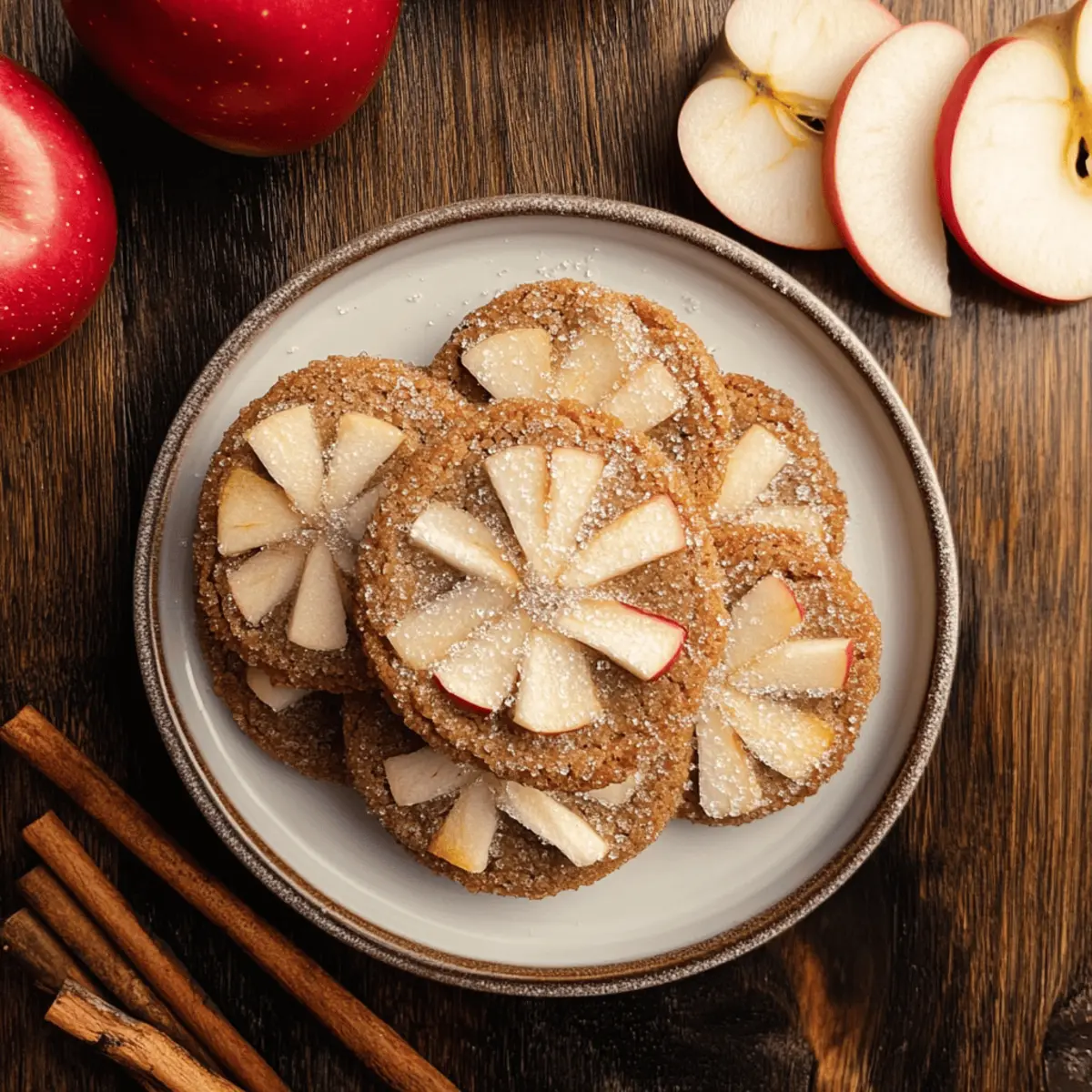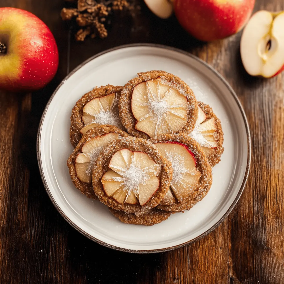 Slice Gala apples thinly and gently press a slice into the center of each cookie. To enhance their flavor and appearance, sprinkle a mixture of sugar and cinnamon over the apple slices, creating a delightful contrast to the warm spiced cookies.