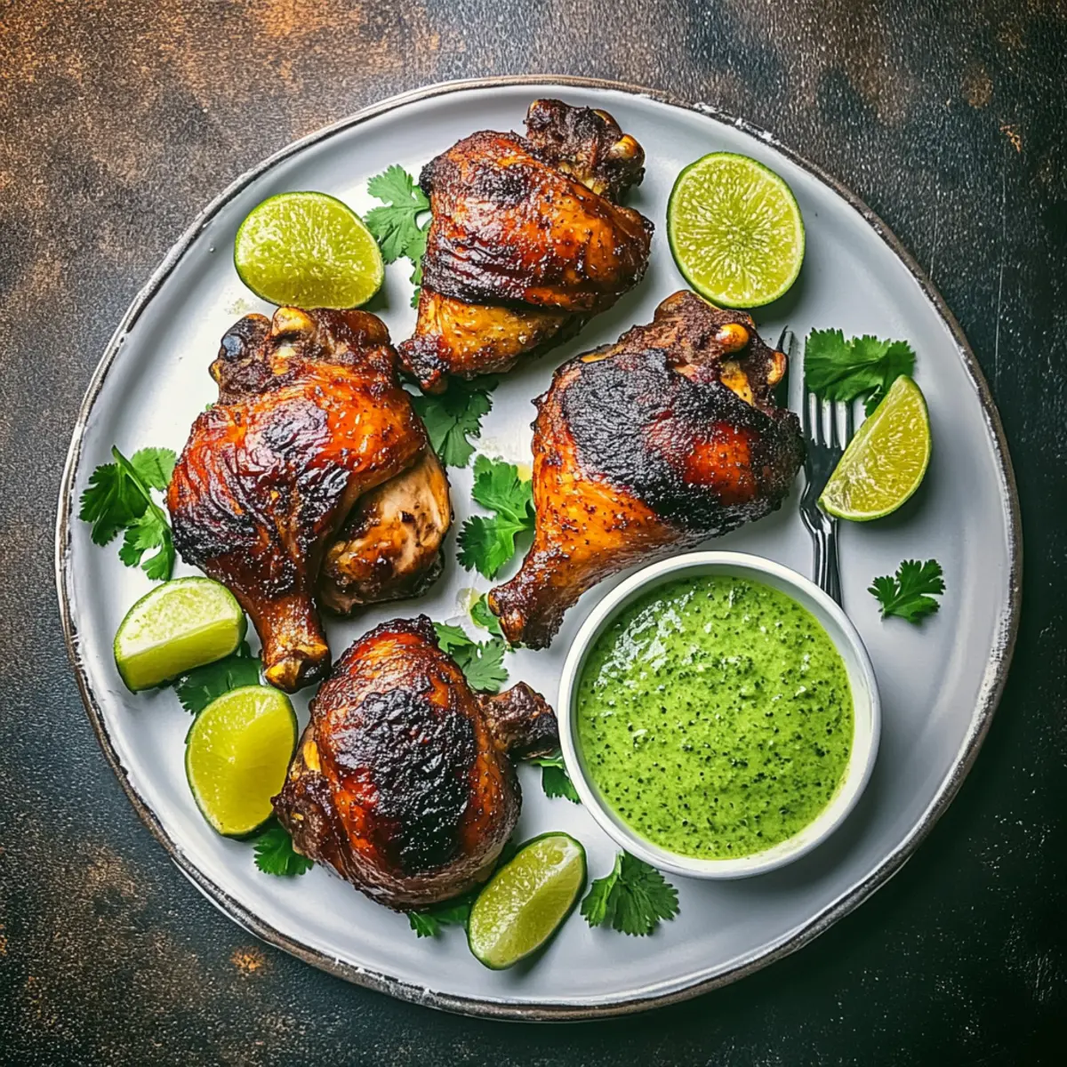 Slice the rested Pollo a la Brasa and serve it alongside the cilantro sauce for dipping. Plating it with lime wedges adds a refreshing twist. Pair with sides like fried yucca, rice, or sweet plantains for a complete meal that embodies the vibrant flavors of Peru. Enjoy this delicious alternative to takeout with your family!