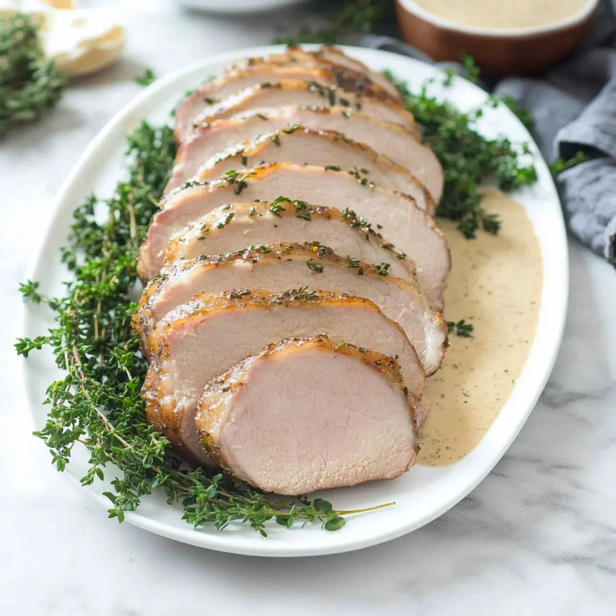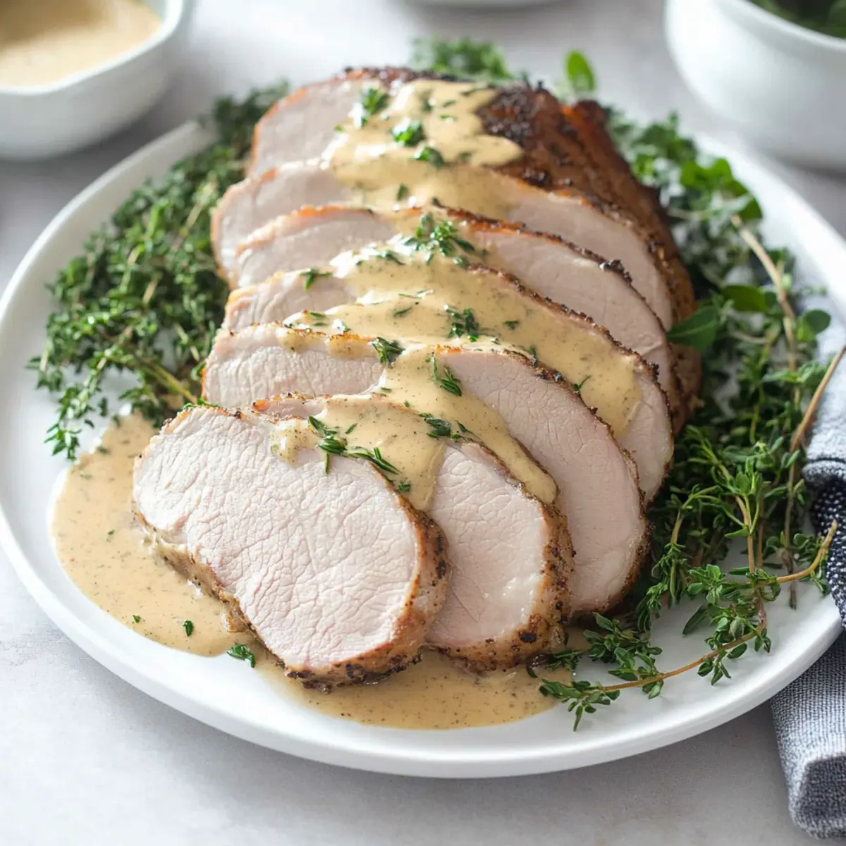 Finish the dijon cream sauce by stirring in dijon mustard and chopped fresh thyme. Taste and adjust seasoning with salt and black pepper as needed. This luxurious sauce will complement the juiciness of your roast, adding a gourmet touch to your dining experience. Serve alongside the sliced pork for a truly special meal.