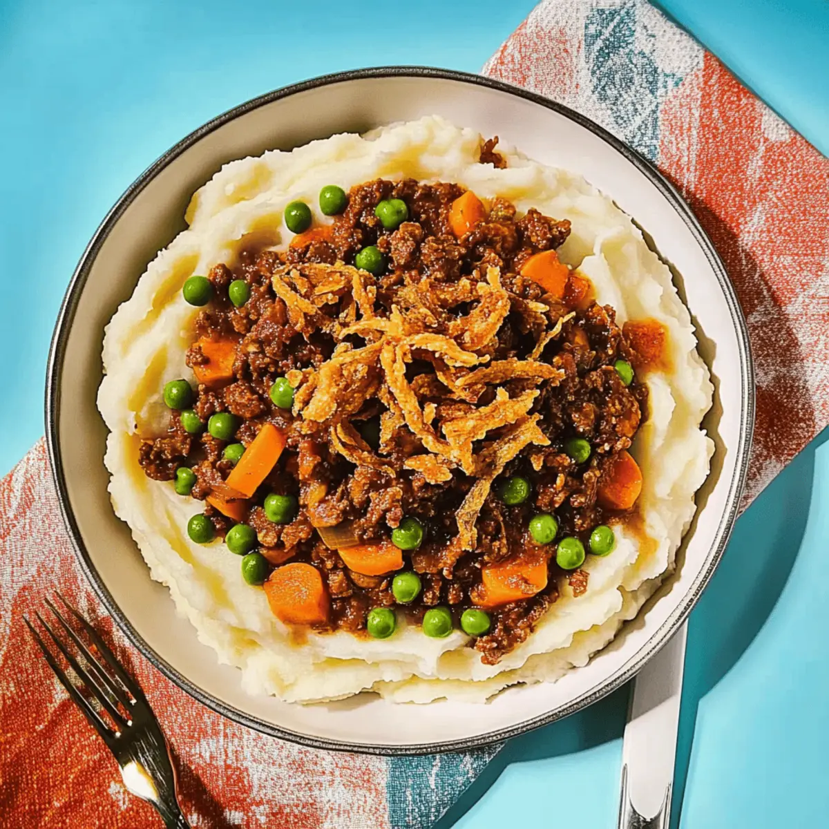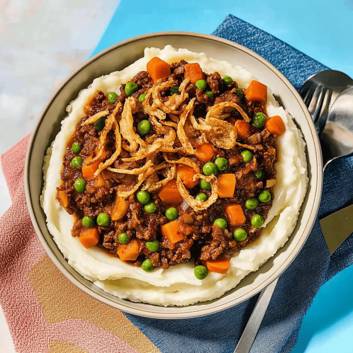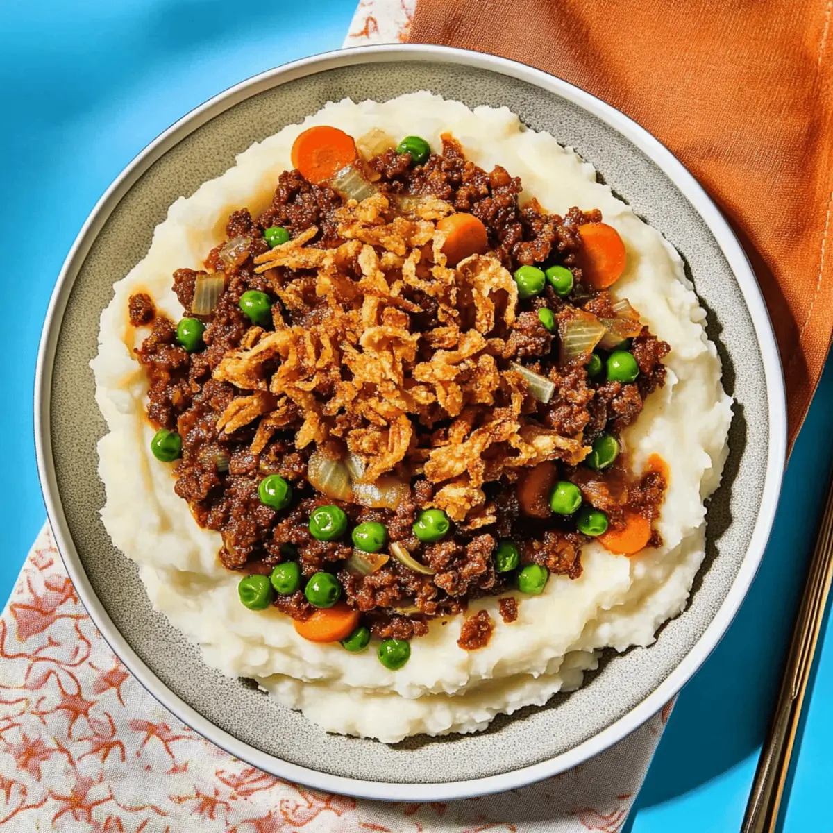 To plate up, create a generous well in the center of a mound of fluffy mashed potatoes. Spoon the hearty ragù over the mashed potatoes, allowing it to cascade beautifully down the sides. Finish with a sprinkle of crispy fried onions on top for that delightful crunch, adding a visual appeal and extra layer of flavor to your comforting dish.