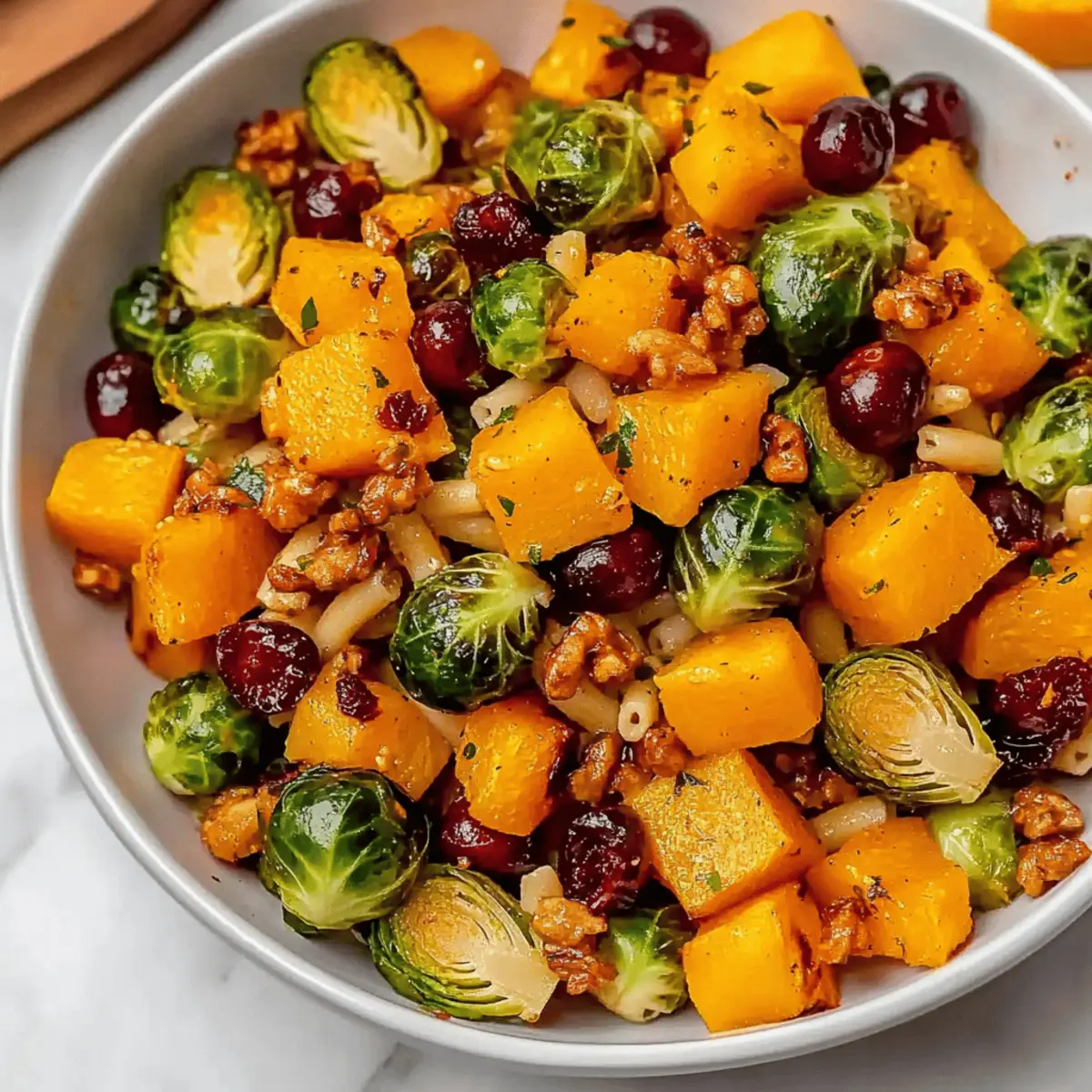 In a large bowl, combine the roasted butternut squash and Brussels sprouts with dried cranberries and chopped pecans. Drizzle the homemade vinaigrette over the top. Gently toss everything together, ensuring the vegetables and nuts are well-coated in the dressing without breaking them apart.