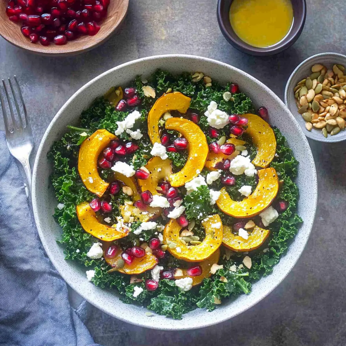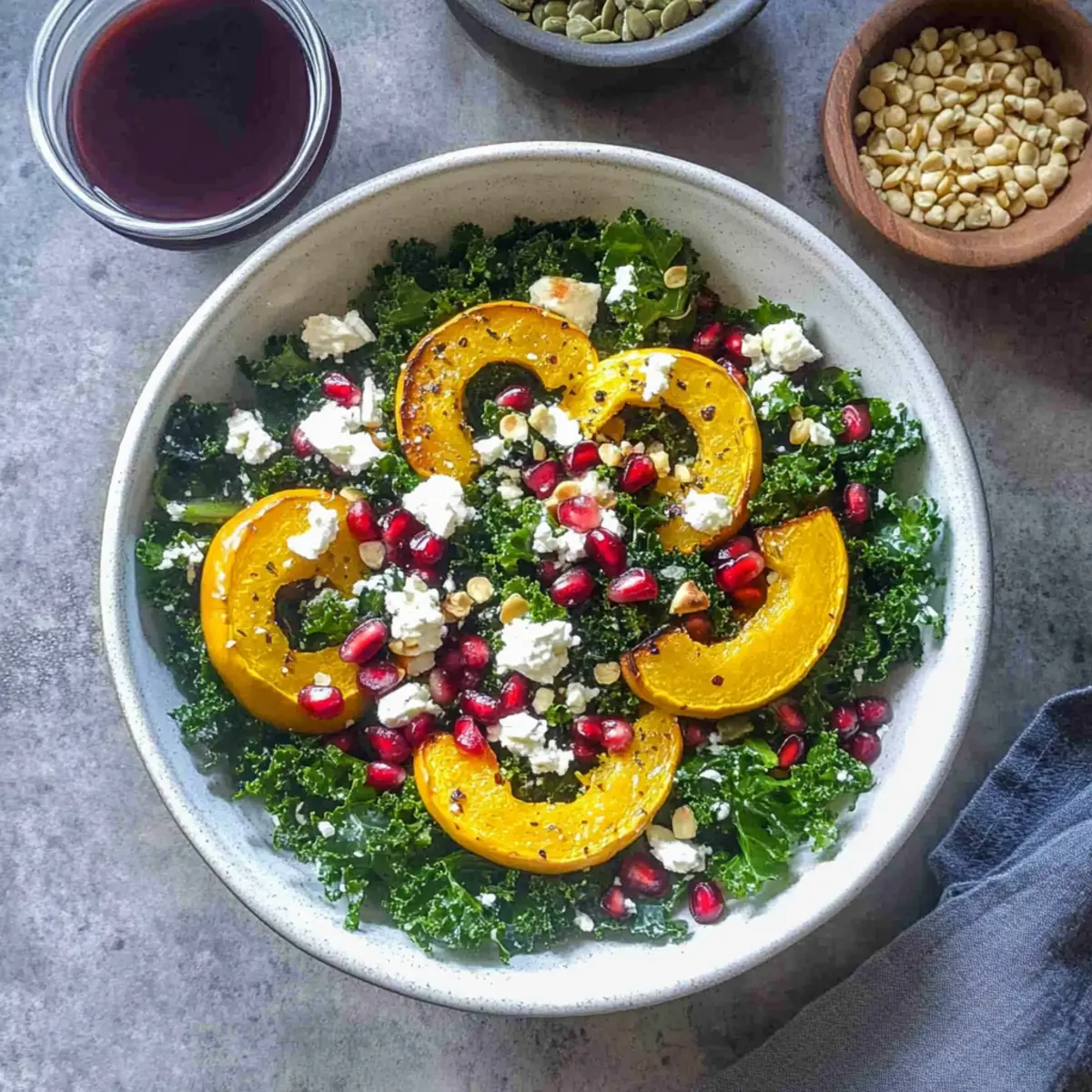 In a large mixing bowl, combine the roasted delicata squash, massaged kale, pomegranate arils, crumbled feta cheese, and pepitas. This mixture highlights the beautiful colors and various textures that make the Roasted Delicata Squash Salad appealing. Gently toss all the ingredients together, taking care not to break the squash too much, ensuring each bite is packed with flavor.