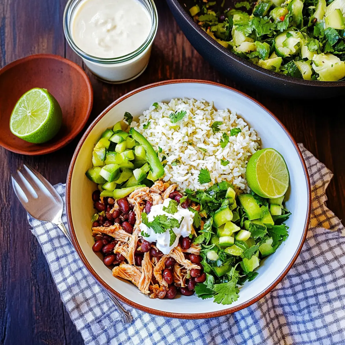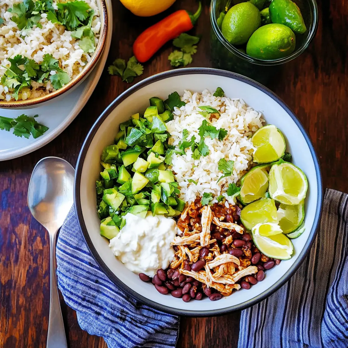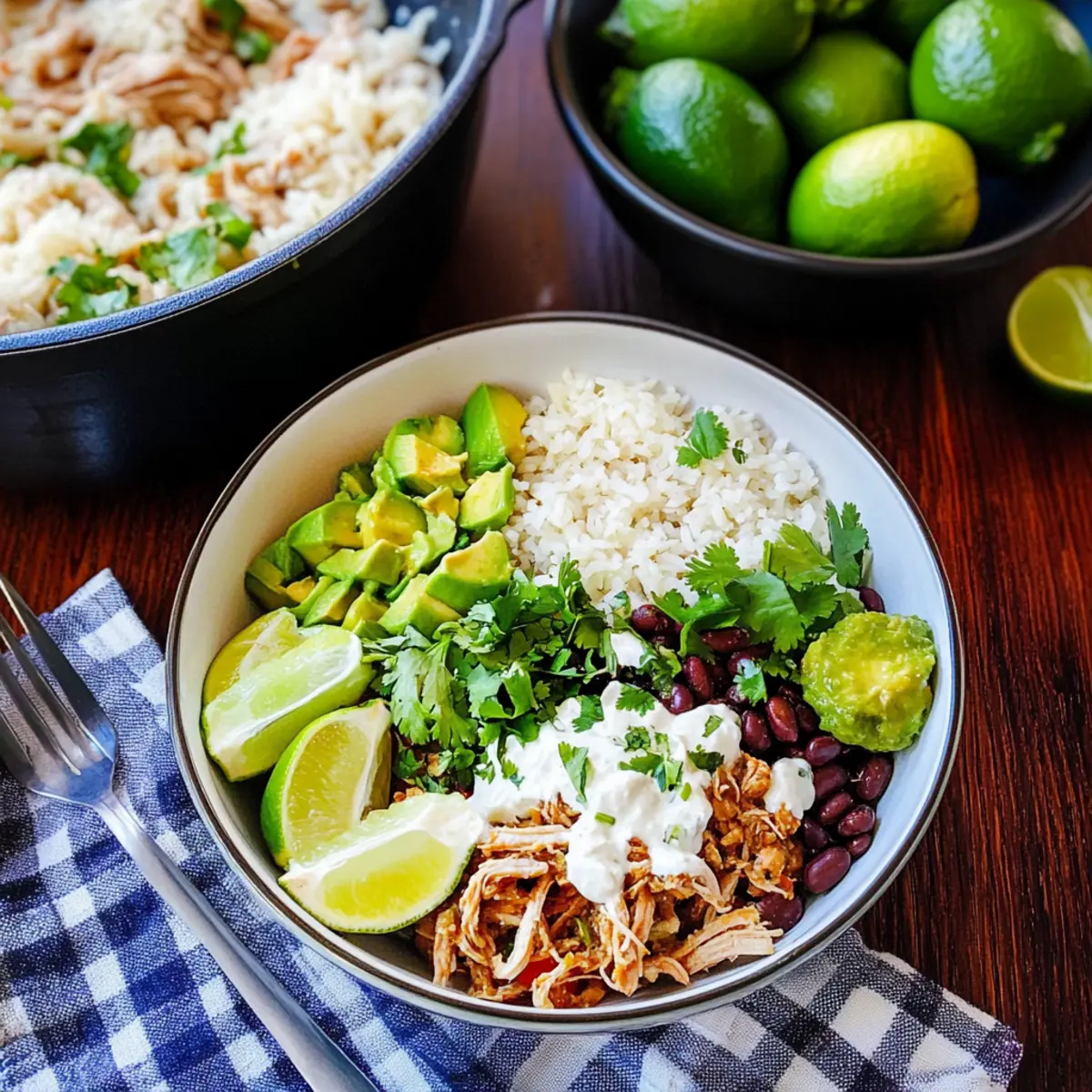 Prepare the cilantro lime rice according to your preferred recipe while the chicken is finishing up. Once ready, serve the shredded chicken and vegetable mix over a bed of warm cilantro lime rice. Garnish with fresh sliced avocados, lime wedges, crumbled cotija cheese, and a dollop of sour cream or Mexican crema for a burst of flavor that complements this satisfying burrito bowl.