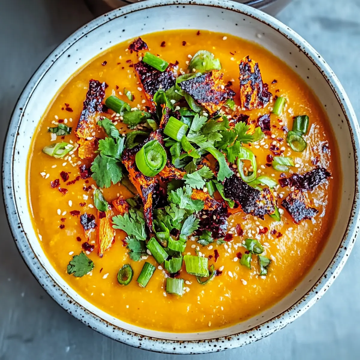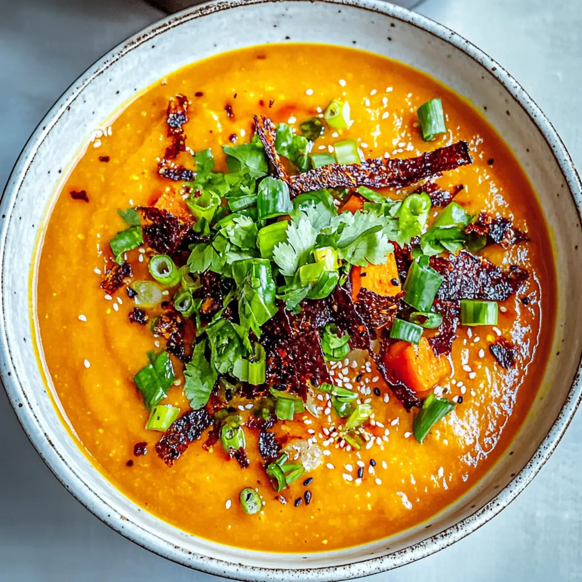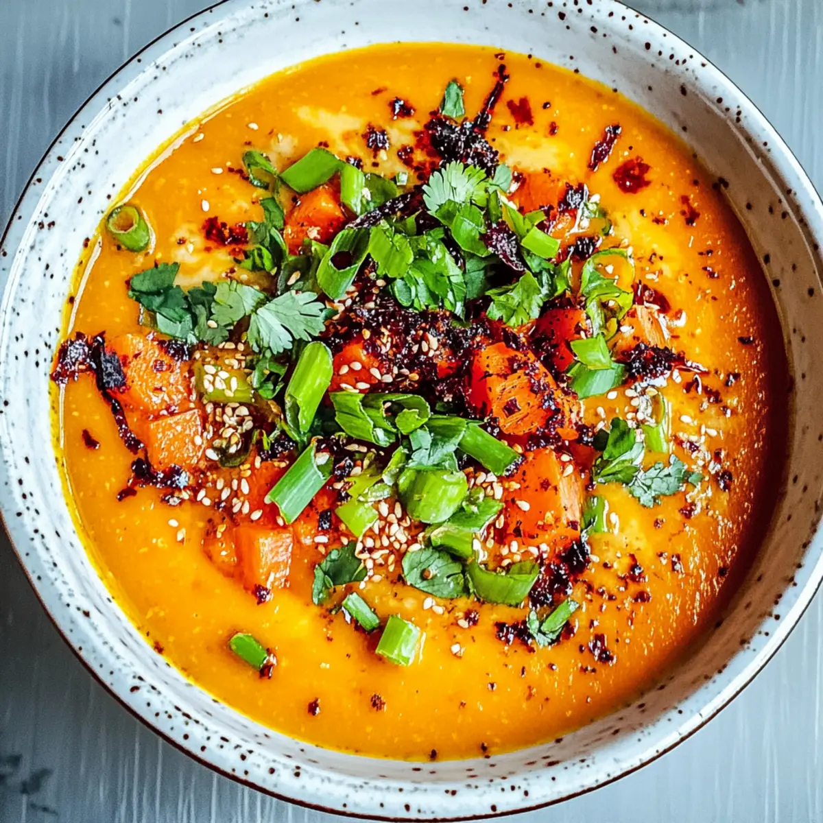 Ladle the Spicy Miso Carrot Soup into bowls and garnish with chopped green onions and fresh cilantro. Serve hot, paired with crusty bread or on its own, providing a warm and nourishing experience that is a hug in a bowl.