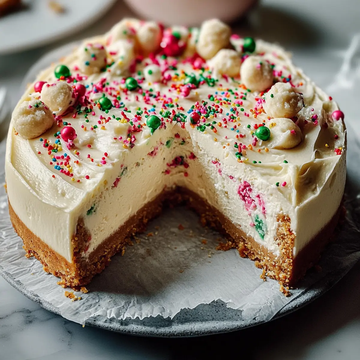 For the cookie dough balls, in a clean mixing bowl, cream together unsalted butter and regenerative organic cane sugar until smooth. Add the pure vanilla extract and milk, mixing until well combined. Slowly mix in the all-purpose flour and salt until a soft dough forms. Fold in any remaining Christmas sprinkles for an extra festive touch, then roll the dough into small balls, approximately one inch in size. Refrigerate these cookie dough balls while you prepare the cheesecake filling.