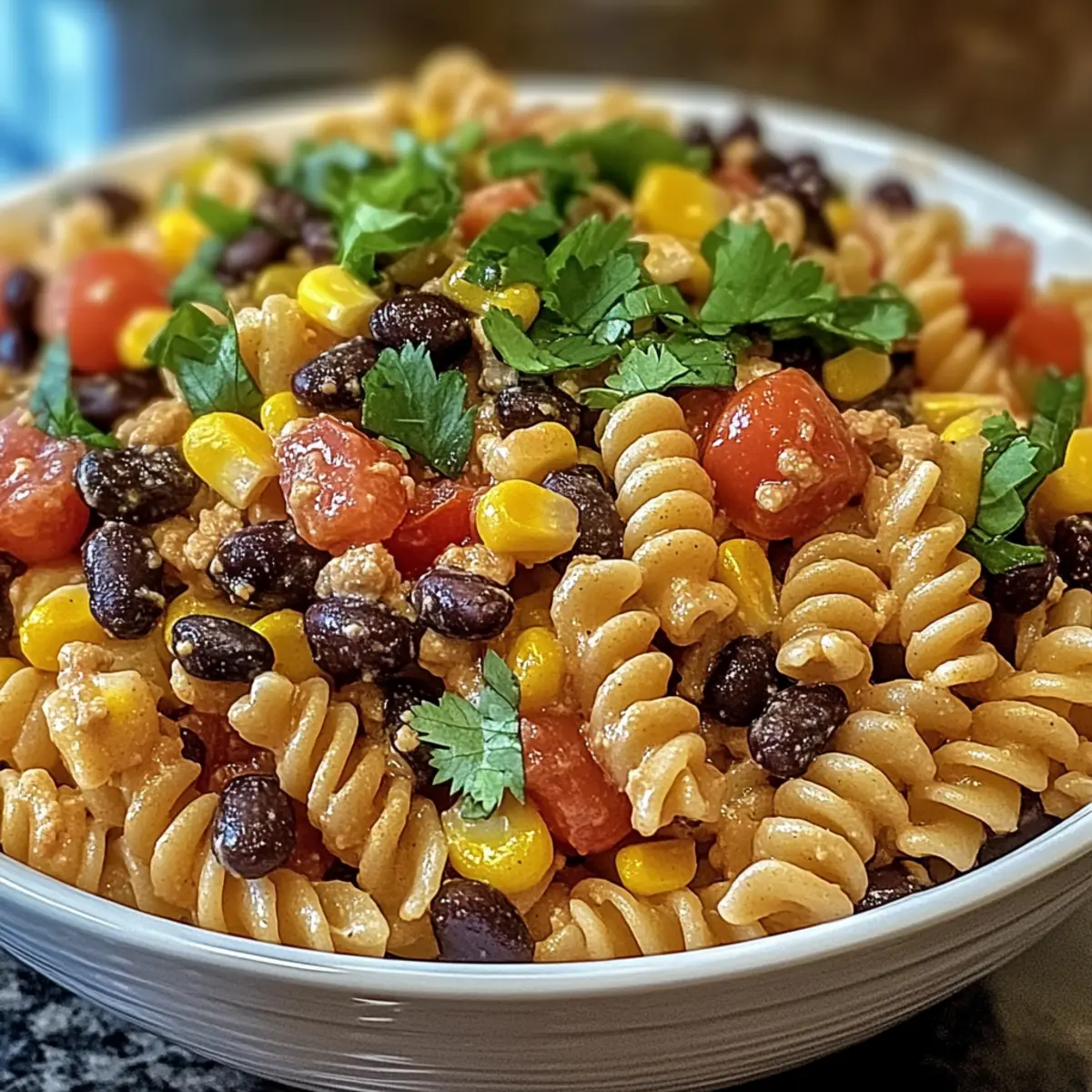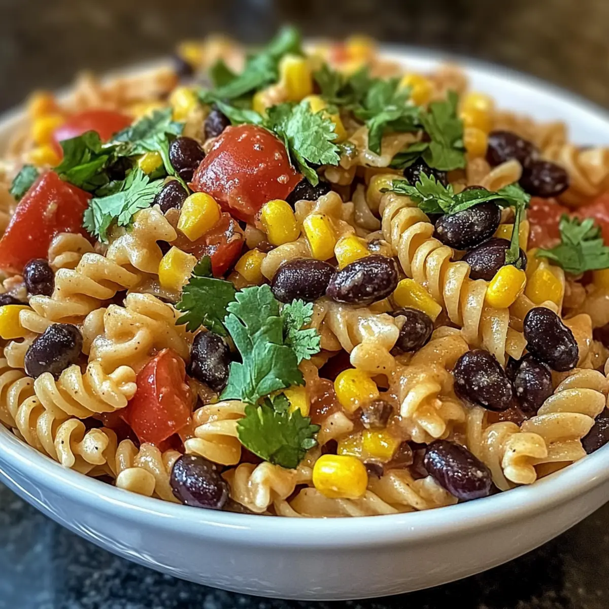 - Combine Ingredients: Add cooled pasta, black beans, corn, and cheese to the vegetables. Pour dressing over and mix gently.